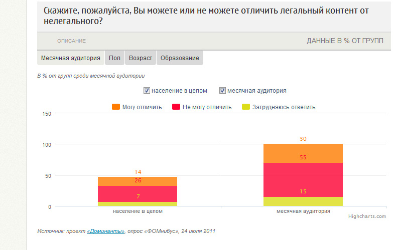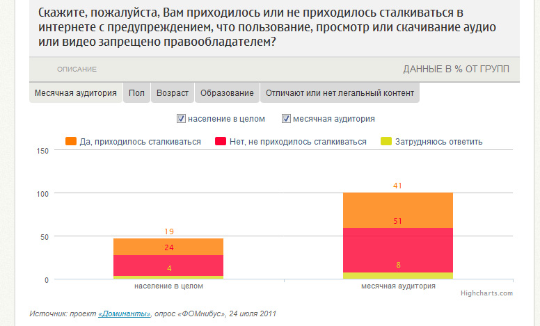 Четверть россиян не отличает пиратский контент от легальногоЕще меньше интернет-пользователей готовы платить за информацию в сетиФонд общественного мнения (ФОМ) и журнал "Интернет в цифрах" проанализировали отношение российских интернет-пользователей к легальному и пиратскому контенту в сети. Выяснилось, что 26% россиян не могут отличить легальный контент от нелегального, для 14% это не составляет труда, еще 7% затруднились с ответом. Потребление медиаконтента в интернете является широко распространенной практикой, говорят социологи. Около 37 миллионов человек (69% интернет-аудитории) просматривали, прослушивали или скачивали аудио и видео. Среди месячной аудитории 41% встречали предупреждение об авторских правах, среди населения в целом - 19%. Чаще других с ним сталкивались мужчины (46%), а также 18-35-летние пользователи (52%). Что касается легального и пиратского контента, то среди людей 18-35 лет и представителей сильного пола доля способных отличить один тип контента от другого выше средней на 8 и 7 п.п. соответственно. Исследователи отмечают, что для большинства пользователей неочевидны различия между "хорошим" и "плохим" контентом. Кроме того, данная проблема весьма далека от них. Это может быть связано с размытостью понятия "легального" в интернете и отсутствием четких критериев отличия. Например, 27% пользователей опознают легальный контент по его хорошему качеству, 24% - по его платности и 9% - по необходимости регистрации. Всего 11% россиян готовы реально платить за просмотр или скачивание информации (среди месячной аудитории - 24%). Абсолютная цифра составляет 13 миллионов человек, что достаточно для создания масштабного рынка платного контента. Социологи также отмечают: из тех, кто может отличить легальный контент от нелегального, 36% готовы "помочь рублем" правообладателю. Заплатив деньги, пользователи хотят получить качественный контент или соблюсти этику. Так, 29% пользователей готовы платить за высокое качество, еще 20% - за надежность и безопасность. Уважение к труду автора и закону отметили 11% и 9% пользователей соответственно. Главным барьером для потребления платного легального контента в интернете оказывается финансовый аспект. 40% пользователей ссылаются на отсутствие материальной возможности / дороговизну контента. Среди тех, кто не хочет тратить деньги, 13% заявило: все необходимое можно получить и бесплатно. По мнению еще 9%, достаточно их затрат на доступ к интернету. Инфорграфика с fom.ru |
