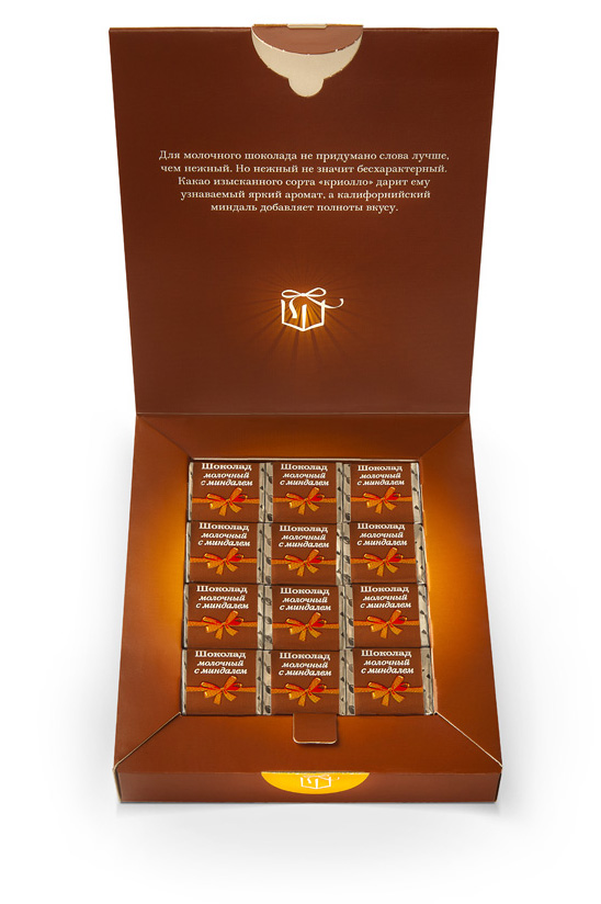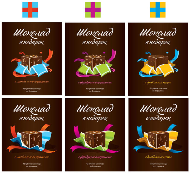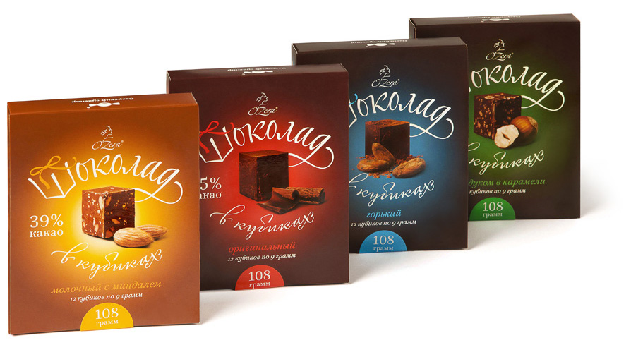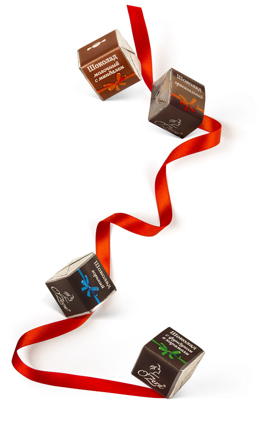 Девять граммов в ротУпаковка шоколада от Студии Артемия ЛебедеваТорговая марка "Озера" задумала продавать девятиграммовые шоколадки разных вкусов - от молочного до горького. В студии серии придумали название и сделали логотип, оформили фантики и упаковку. Четыре вкуса, каждый в своем цвете. "Упаковка получилась нарядной и затейливой - такой и должна быть упаковка шоколада, который не стыдно подарить", - утверждают дизайнеры Внутри коробки сделан специальный язычок, удобно поднимающий шоколадки. Также в оформлении не обошлось без подарочной ленты.