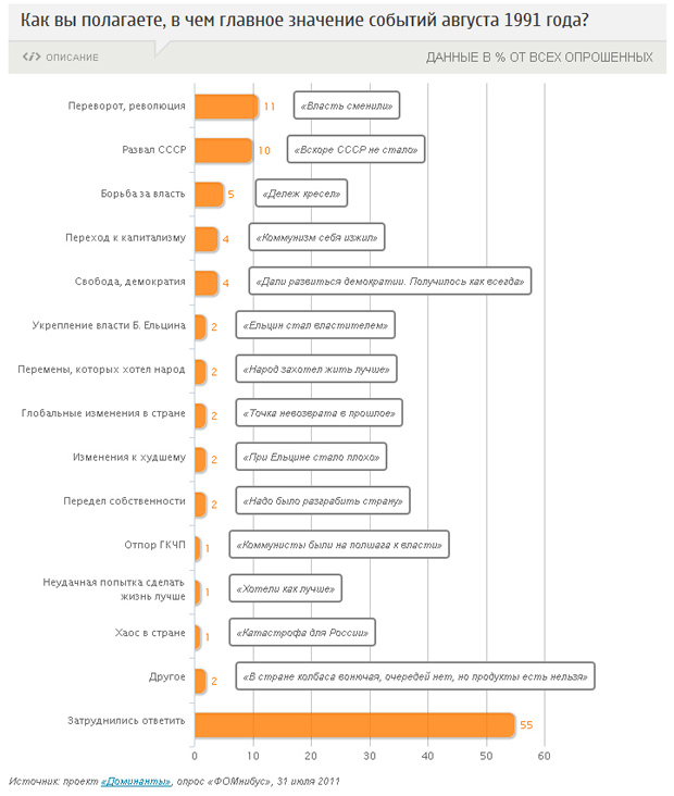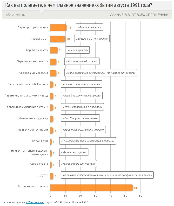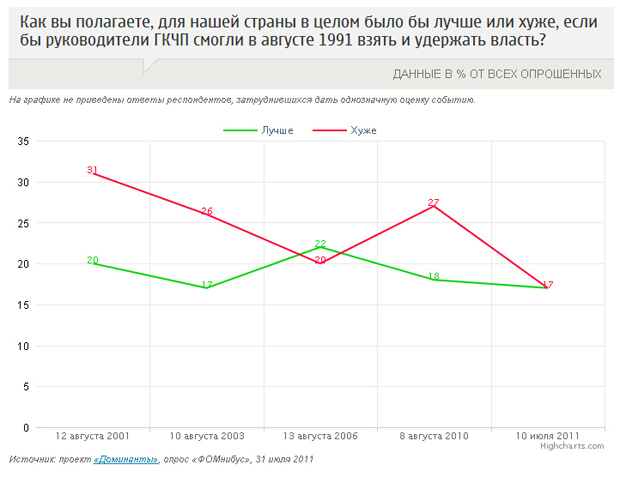 Россияне не понимают значения «августовского путча»Попытке переворота ГКЧП исполнилось 20 лет, соотечественники все менее уверены в его итогахРовно двадцать лет исполнилось сегодня с того момента, как несколько членов ЦК КПСС попытались насильственным способом отстранить от власти первого и последнего президента СССР Михаила Горбачева. Самопровозглашенный орган - «Государственный комитет по чрезвычайному положению» (ГКЧП) поставил себе задачу остановить вектор реформирования страны и воспрепятствовать подписанию «Договора о Союзе Суверенных Государств», который, по мнению идеологов «путча», привел бы к развалу Советского государства. Действия «путчистов» были однозначно квалифицированы и президентом, и Верховным Советом СССР как попытка государственного переворота. Переворот сопровождался вводом в Москву нескольких тысяч солдат и сотен единиц бронетехники, а также ужесточением цензурного давления на СМИ. В ходе столкновений с подконтрольными «путчистам» войсками погибли трое жителей столицы – Илья Кричевский, Дмитрий Комарь и Владимир Усов, всем троим посмертно было присвоено звание Героев Советского Союза. Провал «августовского путча» ускорил ликвидацию агонизирующей системы и способствовал становлению демократический ценностей. Все его зачинщики были арестованы и преданы суду, за исключением покончившего с собой министра внутренних дел Бориса Пуго. Фонд «Общественное мнение» к годовщине столь знакового для России события предложил соотечественникам поразмыслить, было бы лучше или хуже, если бы руководители ГКЧП в 1991 году смогли взять и удержать власть. Как показали результаты исследования ФОМ, единого мнения в этом вопросе нет: 17% опрошенных уверены, что с приходом «путчистов» дела страны пошли бы в гору, противников переворота - ровно столько же. Более половины россиян не смогли ответить на вопрос, в чем главное значение событий двадцатилетней давности.