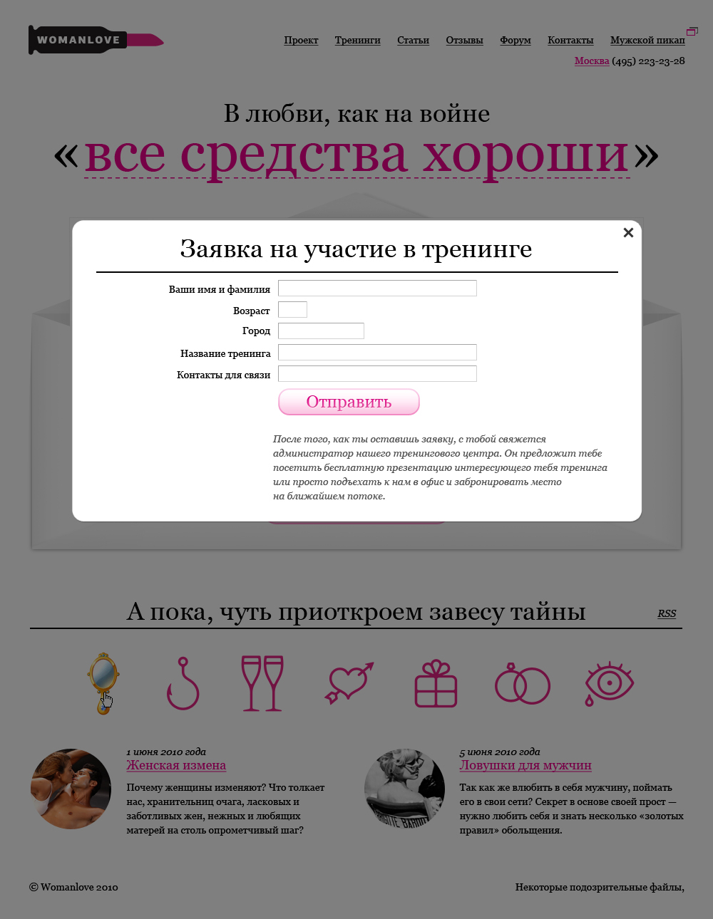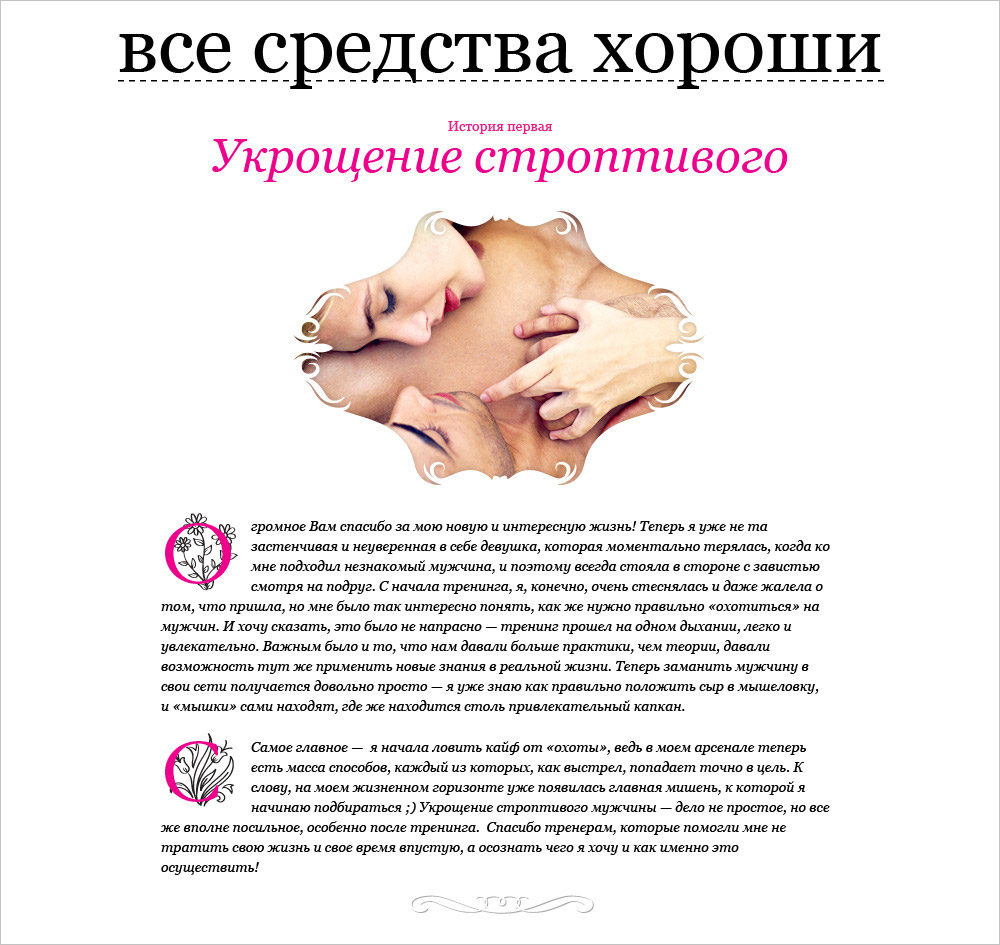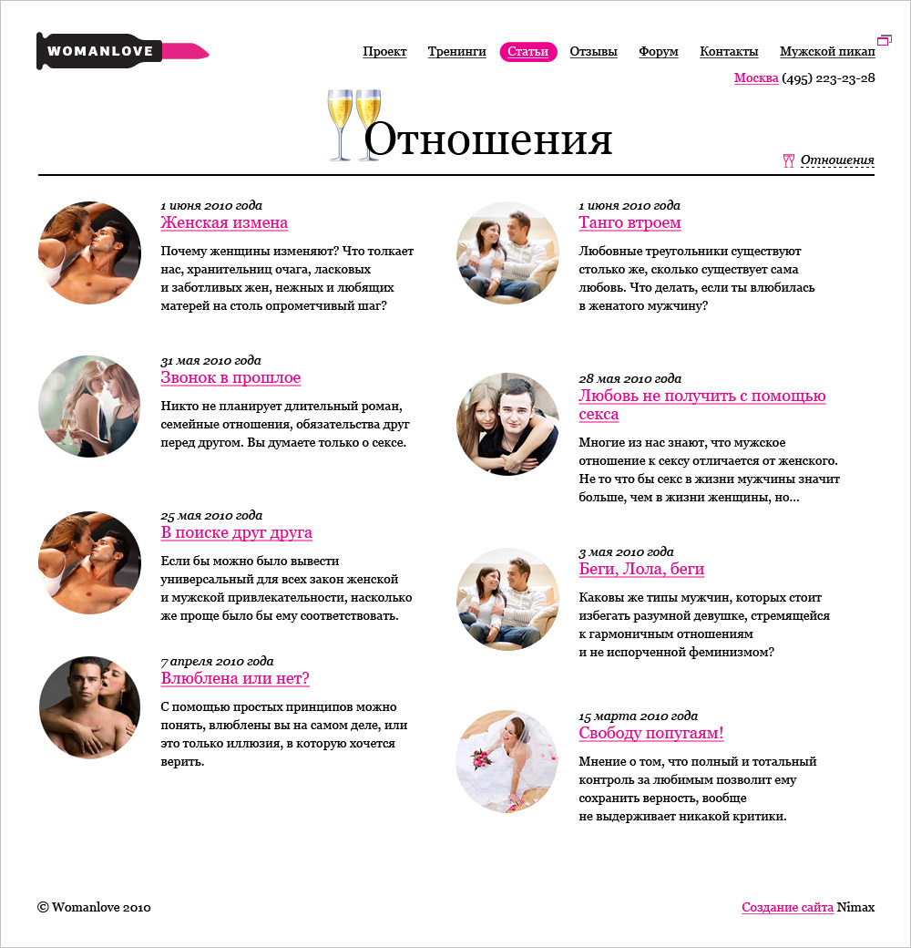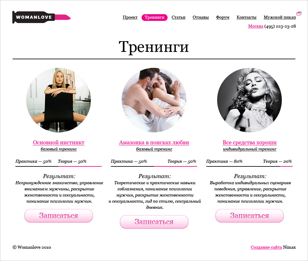 Nimax сделал портал для девушек-пикаперовВ агентстве Nimax сделали сайт для проекта Womanlove - образовательной системы для девушек, в которую включены тренинги, индивидуальные занятия и клубные вечеринки для выпускниц. Проект Womanlove появился несколько лет назад, когда тренеры команды Pickup.ru разработали специальную систему обучения взаимодействию с мужчинами, устав отказывать девушкам, желавшим пройти мужской тренинг. В рамках концепции проекта в агентстве придумали и нарисовали логотип - боевой "помадопатрон" современной амазонки. Подкрасить губки или выстрелить прямо в сердце понравившегося мужчины - в обоих случаях эта вещь совершенно незаменима. Для проекта в "Nimax" сделали креативную и графическую концепцию, сохранив узнаваемость проекта Pickup.ru, который тоже разрабатывался в агентстве. Также в агентстве сделали прототип сайта и создали дизайн-макеты всех страниц. Как и на мужском сайте, главная страница сайта про женский пикап встречает посетительниц актуальными вопросами, на которые очень хочется получить ответы. Там же анонсируется самый главный тренинг проекта "Основной инстинкт" и располагается кнопка записи на курс для тех, кто не хочет терять ни минуты драгоценного времени. Слоган проекта раскрывается реальными рассказами участниц, которые уже прошли курс и изменили свою жизнь и свои взаимоотношения с мужчинами. В качестве дополнительного оформления рассказов участниц дизайнеры агентства подготовили буквицы с подложкой из растительных элементов для всего алфавита. Полезная теоретическая информация располагается в разделе статей. Именно там все женские штучки и хитрости разложены по полочкам и структурированы по рубрикам. В разделе тренингов можно выбрать подходящий курс, время и место, свериться с целями и ожидаемыми результатами, посмотреть план занятий и оценить процентное соотношение теории и практики. После запуска новой версии сайта, количество заявок на тренинги увеличилось в три раза. Также увеличилось время пребывания на сайте и глубина просмотра, а количество отказов при первом заходе, напротив, уменьшилось. Состав творческой группы