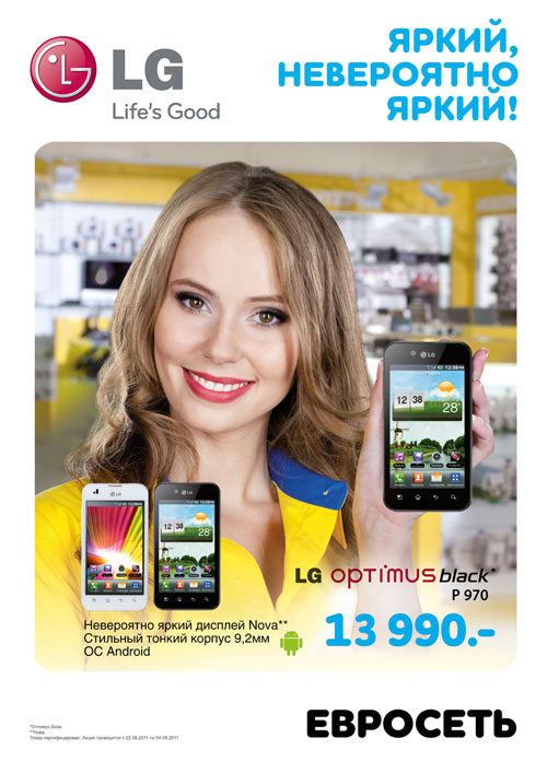 «Евросеть» сделала ролик про жестьСтартовала рекламная кампания LG Optimus BlackКомпания «Евросеть» объявила о старте рекламной кампании смартфона LG Optimus Black. Трансляция рекламного ролика пройдет с 22 августа по 4 сентября 2011 года на федеральных каналах «Первый», Россия 2, ТНТ, НТВ, СТС, Ren TV, DTV, MTV, MUZ TV, 2x2, 5 канал, ТВ-3. Рекламная кампания будет поддержана размещением POS-материалов в салонах, а также баннерами в интернете. Состав творческой группы Евросеть Fresh Production |