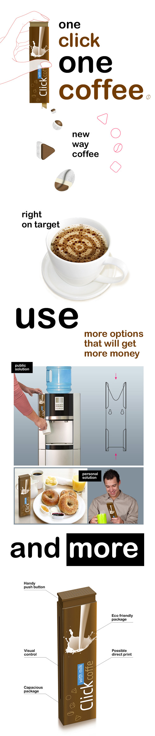 Растворимый кофе меняет форматВ студии FormFarm завершась работа по созданию нового формата быстрорастворимого кофе.В эпоху цифровых технологий и Интернета должен был наконец-то появится соответствующий этому времени продукт: кликабельный кофе, он же ClickCoffe. ClickCoffe - это более насыщенный вкус, удобство хранения и транспортировки, чистота и отсутствие всевозможных банок, сахарниц и пакетиков, точная дозировка, быстрота процесса заваривания, 100% контакт бренда и потенциального потребителя, даже если он не любит растворимый кофе (особенно в рамках офисов и публичных местах), уникальная рекламная поверхность и многое другое. Даный проект разрабатывался для крупного производителя растворимого кофе и выйдет в ротацию под одной из известных марок. |