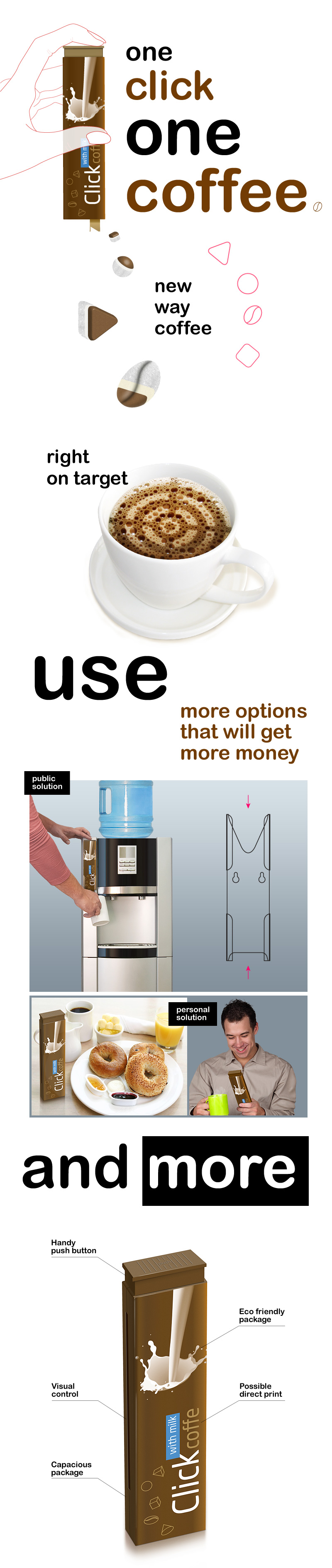Растворимый кофе меняет форматВ студии FormFarm завершась работа по созданию нового формата быстрорастворимого кофе.В эпоху цифровых технологий и Интернета должен был наконец-то появится соответствующий этому времени продукт: кликабельный кофе, он же ClickCoffe. ClickCoffe - это более насыщенный вкус, удобство хранения и транспортировки, чистота и отсутствие всевозможных банок, сахарниц и пакетиков, точная дозировка, быстрота процесса заваривания, 100% контакт бренда и потенциального потребителя, даже если он не любит растворимый кофе (особенно в рамках офисов и публичных местах), уникальная рекламная поверхность и многое другое. Даный проект разрабатывался для крупного производителя растворимого кофе и выйдет в ротацию под одной из известных марок. |