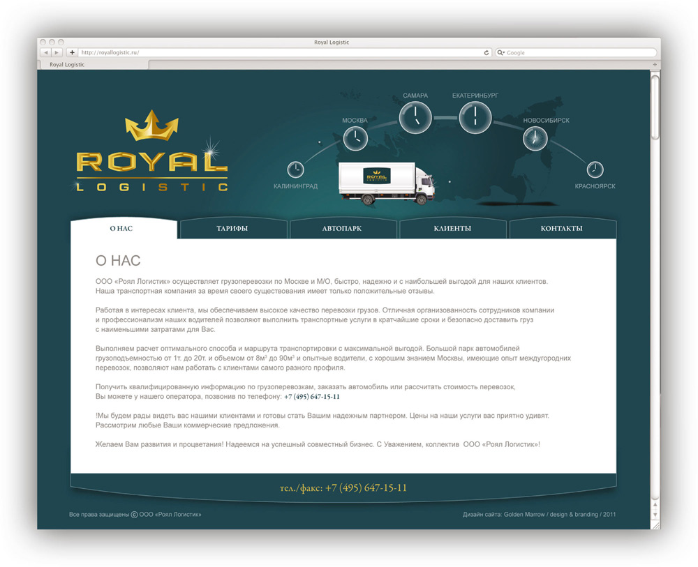 Империалистический фирменный стильБрендинговое агентство Golden Marrow design & branding финализировало комплексный проект по разработке системы визуальной идентификации транспортной компании Royal Logistic. Royal Logistic - новый бренд на рынке грузоперевозок. Основным пожеланием клиента стало создание империалистического стиля, соответствующего названию компании, подчеркивающего надежность, безопасность и полную уверенность в своевременной доставке грузов в конечный пункт. Специалисты Golden Marrow создали знак, сочетающий в себе стремительность дороги и основательность королевской символики, дополненный брутальным типографическим решением и поддерживаемый фирменными цветами. Знак подлежит к использованию в двух фирменных цветах - золотом и тёмно-изумрудном, в зависимости от способов печати и объекта применения. В рамках работы над проектом разработаны логотип компании и фирменный стиль, оформление автомобилей, создан сайт компании.
