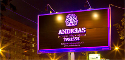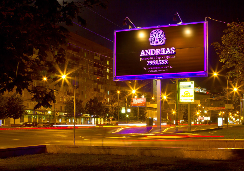 News Outdoor: проект для ресторана AndreasВ Москве на Кутузовском проспекте появилась реклама ресторана Andreas. В ней поверхность билборда News Outdoor, на которой был реализован проект, засияла яркими неоновыми огнями. Такое решение впервые применяется на этом формате наружной рекламы. Ресторан Andreas находится немного в глубине Кутузовского проспекта и не виден с проезжей части, поэтому задача данного проекта - привлечь новых посетителей, но сделать это таким образом, чтобы реклама, размещаемая на поверхности 6х3, была не похожа на другие нестандартные outdoor-кампании в Москве. В результате было решено сделать из билборда визитную карточку ресторана, но с подсветкой важной информации и самой поверхности. Для этих целей использовалась дополнительная композитная панель, которая прикреплена к конструкции на расстоянии 20 см от нее. Для создания эффекта контуража по контуру щита расположены неоновые трубки. Накладные объемные элементы с информацией прикреплены к конструкции на дистанционных держателях и также подсвечены неоновыми трубками. Надписи выполнены методом инкрустации в панель из оргстекла с внутренней подсветкой по той же технологии. Проект разработан и реализован заказчиком, монтаж осуществляла компания News Outdoor. Аналогов ему в Москве нет. Клиент остался доволен: реклама Andreas теперь заметна и днем, и ночью. |