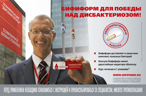 Поскольку, большая часть целевой аудитории при выборе лекарственных препаратов руководствуется мнением специалистов, то концепция продвижения бренда основывается на квалифицированных экспертных советах. В серии ТВ-роликов "Конференция по дисбактериозу", разработанных РС "Идальго-Имидж", в простой и доступной форме показано, как препарат "Бифиформ" работает на этапах профилактики и лечения заболевания. Основным инструментом продвижения продукта в данной кампании стала реклама на телевидении. 1 августа рекламные ролики "Конференция по дисбактериозу" были запущены в ротацию в эфире федеральных телеканалов: "Первый канал", "СТС", "Россия", "Домашний" и "ДТВ". Всего в рамках кампании транслировались 2 оригинальных ролика хронометражем 15 и 30 секунд. Кроме того, для продвижения бренда "Бифиформ" были созданы спонсорские заставки в сериалах и программах для семейного просмотра. Заставки вышли в эфире телеканала "СТС" по выходным Маркетинг-директор компании "Ферросан Интернейшнл А/С" Ольга Шумкова отмечает: "Традиционно август считается периодом относительного затишья на медиа рынке. Однако мы решили напомнить о бренде "Бифиформ" именно сейчас! Ведь с окончанием лета и осенью отдохнувшие горожане "привозят" из отпусков не только яркие впечатления, но и нарушение баланса кишечной микрофлоры.. К этому неприятному состоянию могут приводить перемена климата, необычные блюда и знаменитый all inclusive. "Бифиформ" поможет восстановить пищеварение и победить дисбактериоз - с такой защитой и осень встречаем во всеоружии, и приятные воспоминания об отпуске сохраняем.". Руководитель проекта РС "Идальго-Имидж" Ирина Ларцева: "Результаты двух предыдущих кампаний помогли нам достаточно точно рассчитать максимально эффективные для продвижения продукта коммуникации. Поэтому летний флайт сосредоточен на надежных и проверенных медиа: ТВ и печатаных СМИ. В частности, мы расширили представление продукта, включив его в спонсорские заставки на семейном канале СТС. Таким образом, мы лишний раз подчеркиваем "Бифиформ" - препарат для всей семьи. Запуская очередной этап кампании в "бархатный" сезон отпусков, мы рассчитываем значительно укрепить позиции бренда, как самого эффективного и надежного средства для победы над дисбактериозом". В сентябре масштабная ТВ-кампания будет поддержана рекламой в прессе. Реклама препарата выйдет в журналах: "Shape", "Story", "Mamas&Papas", "Здоровье", "Домашний Очаг", "Мама, это Я", "Расти первоклашка", "Счастливые родители", а также в специальном выпуске журнала "Мой кроха и я". ТВ-кампания прошла в августе. Размещение в печатных СМИ запущено с сентября и завершится в ноябре 2011 года.