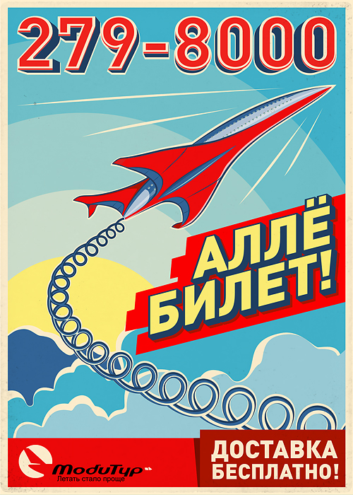 В «АТАКУ!» за билетамиРекламная кампания для мобильной кассыРекламное агентство "АТАКА!" разработало серию плакатов для наружной рекламы мобильной кассы "МобиТур", работающей на рынке Краснодарского края. Основной задачей для создания маркетинговой коммуникации было повышение уровня продаж авиа- и железнодорожных билетов по телефону. Агентство "АТАКА!" представило креатив и дизайн для четырех рекламных плакатов, которые размещались поочередно в течение 4-х месяцев в Краснодаре в "горячий" весеннее-летний сезон. Все плакаты выполнены в разной стилистике. В основу некоторых иллюстраций положен стиль ретро-фантастики, киноафиш 60-х, комиксов. Состав творческой группы: