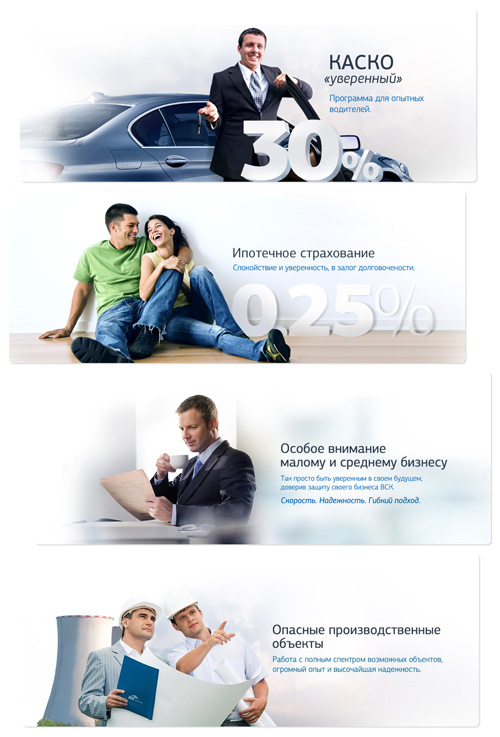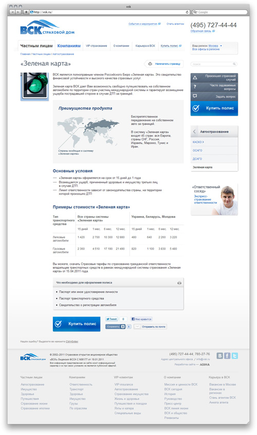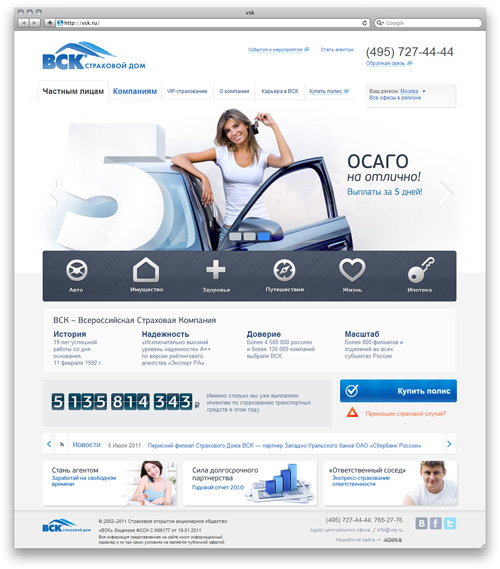 AGIMA выпустила новый сайт Страхового Дома ВСККомпанией Страховой Дом ВСК было принято решение о создании нового, современного и удобного в пользовании корпоративного сайта. Для достижения поставленной цели он привлек агентство интернет-маркетинга AGIMA. Что должен предоставлять пользователям сайт ведущей страховой компании? В первую очередь это полный и понятный перечень ее страховых продуктов с возможностью их заказа, информация по урегулированию убытков, хорошо налаженную обратную связь с клиентами компании и предоставлять оптимальное количество полезной информации о страховщике. Одним из достоинств нового сайта стала удобная и интуитивно понятная навигация. Так, например, сайт вместо одной привычной входной страницы имеет 3 разные точки входа, адаптированные под разных клиентов: частных лиц, компаний и VIP клиентов. Все перемещения по сайту производятся с помощью "умного меню" - которое, без перезагрузки страницы, позволяет быстро добраться до любого необходимого раздела, многоуровневой системы сайта. Так же, для дополнительной фильтрации контента, на сайте был разработан механизм геотаргетинга. В основу визуальной концепции сайта вошли образы успешных, деловых, жизнерадостных клиентов ВСК. Ни один элемент сайта не остался без внимания веб-дизайнеров, даже нетиповые для Интернета шрифты с помощью технологии автоматического преобразования присутствуют практически на всех страницах сайта. А во всех формах производиться автоматическая замена стандартных стилей полей на уникальные, соответствующие общей дизайн-концепции сайта. Была проделана огромная работа по визуализации страниц страховых программ, а под основные страховые программы были подготовлены рекламные баннеры, которые с помощью анимированного слайдера выводятся в соответствующих тематических разделах. Всего при разработке нового сайта ВСК было подготовлено более 150 уникальных дизайн-макетов страниц. Интересной идеей Страхового Дома, реализованной на сайте стала публикация на главной странице сайте счетчиков выплат по основным видам страхования. Впервые Страховой Дом ВСК сообщает своим клиентам актуальные цифры по выплатам со страниц своего сайта. Счетчики в реальном времени по SOAP протоколу подгружают актуальные данные о количестве выплаченных средств компанией своим клиентам за последний год! Для формирования требуемого облика компании веб-дизайнерами студии AGIMA было уделено много времени представлению подробной информации о самом Страховом Доме ВСК. Оригинальной идеей Страхового Дома ВСК, было представить журналистам, агентствам и партнерам компании возможность самостоятельно, прямо с сайта, скачивать необходимые изображения и элементы фирменного стиля в разном качестве и разрешении. Для этого нами был разработан уникальный инструмент, Медиа-библиотека, в которой можно выбрать все необходимые для скачивания файлы и выгрузить себе одним архивом, а так же поделиться им со своими друзьями в социальных сетях. Новый сайт должен стать плацдармом активного позиционирования компании в социальных сетях. Сейчас практически любым контентом, представленным на сайте, можно поделиться со своими друзьями в Facebook, Вконтакте и Twitter. В планах еще более плотная интеграция сайта с функционалом социальных сетей. В дальнейшем ВСК планирует запуск на 