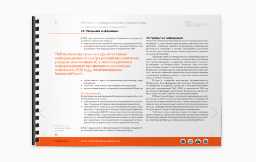 Graphic Productions разработала дизайн годового отчета для ТМКДизайн демонстрирует устойчивое развитие компании в течение 10 лет ее существования.Graphic Productions создала дизайн юбилейного годового отчета для ТМК. Один из лидеров трубной отрасли в России, ТМК празднует в этом году десятилетие. Электронную версию годового отчета для акционеров за 2010 год разработало агентство Graphic Productions. Основная идея креативной концепции отражает масштабность проектов, в которых участвует ТМК, и демонстрирует устойчивое развитие компании в течение 10 лет ее существования. В годовом отчете используются авторские иллюстрации с изображениями различных проектов и местностей, где используется продукция ТМК. Электронная версия - это наиболее удобный вариант годовой отчетности для ТМК. В формате PDF предусмотрена удобная навигация, позволяющая переходить от раздела к разделу быстро и, таким образом, наиболее эффективно просматривать документ. "Электронная версия годового отчета ТМК за 2010 год является профессиональным решением поставленных перед компанией Graphic Productions задач, Илья Житомирский, Директор Дирекции по внешним связям, ОАО "ТМК" В отчете реализованы оптимальные способы подачи информации, интересные дизайнерские и графические находки. Отчет практичен, обладает удобной навигацией и современными интерактивными инструментами". ![]() ![]() ![]() ![]() ![]() ![]() ![]() ![]() ![]() ![]() ![]() ![]() ![]() ![]() ![]() ![]() ![]() ![]() ![]() ![]() ![]() ![]() ![]() ![]() |