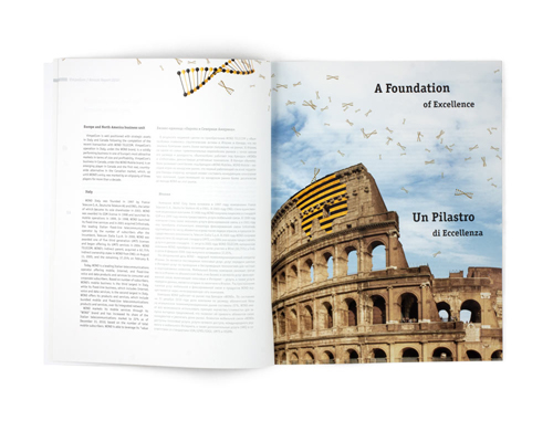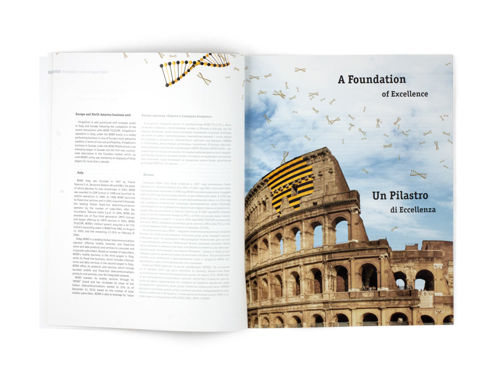 «ВымпелКом» представил дизайн годового отчетаАгентство "Экспресс Медиа Сервис" выиграло тендер на разработку дизайна годового отчета компании "ВымпелКом Лтд". Перед агентством стояла задача отразить объединение "ВымпелКом Лтд" с WIND TELECOM S.p.A., одной из ведущих телекоммуникационных компаний мира, которая предоставляет услуги мобильной, фиксированной и международной связи, а также широкополосного доступа в Интернет в Европе, Азии, Африке и Северной Америке. Сделка, завершившаяся в апреле 2011 года, позволила "ВымпелКом Лтд" стать одним из крупнейших операторов сотовой связи в мире. Главная идея годового отчета - показать эволюцию и наглядно продемонстрировать, как новаторский дух руководства способствует стабильному росту и увеличению прибыльности компании в различных странах и сегментах бизнеса. Эту непростую задачу удалось решить, разработав символ корпоративных стандартов и ценностей "ВымпелКома Лтд", который объединяет все географические бизнес-единицы нового глобального телеком оператора. Концепция основана на простом и узнаваемом образе - спирали ДНК, выполненном в корпоративных цветах компании. Все иллюстрации локализованы для соответствующих регионов и призваны поддержать основное послание отчета - объединенная компания усиливает конкурентные преимущества, что позволяет ей стать лидером на развивающихся рынках и выйти на новые территории. Состав творческой группы: