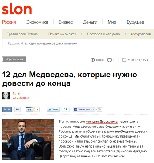 Аркадий Дворкович отрицает свою причастность к публикации на Slon.ruПомощник президента России через Twitter заявил, что не писал политическую статью «12 дел Медведева, которые должен доделать Путин»Сегодня утром на портале Slon.ru появилась статья под авторством Аркадия Дворковича «12 дел Медведева, которые должен доделать Путин». В настоящее время данная публикация «поменяла» своё авторство. Вместо Аркадия Дворковича теперь автором «12 дел Медведева» значится старший редактор Slon.ru Тоня Самсонова. Кроме того, статья немного изменила название («12 дел Медведева, которые нужно довести до конца») и содержание, к которому добавилось предисловие с сообщением о том, что портал «попросил Аркадия Дворковича перечислить проекты Медведева, которые будущему президенту России необходимо довести до конца. Мы обратились к помощнику президента с просьбой написать, он прислал основные тезисы. Возможно, было неправильно выдавать эти тезисы за готовую статью (приносим Аркадию Дворковичу извинения)». В статье говорится о том, что необходимо будет сделать Владимиру Путину, если он снова станет президентом: модернизировать экономику, оказывать противодействие коррупции, осуществлять приоритетные национальные проекты, а также новые международные инициативы. Однако помощник президента свою причастность к колонке отрицает. «Для slon.ru я ничего не писал, "12 дел..." - компиляция из разных источников. Будьте аккуратнее», - отмечает Дворкович в Twitter. |