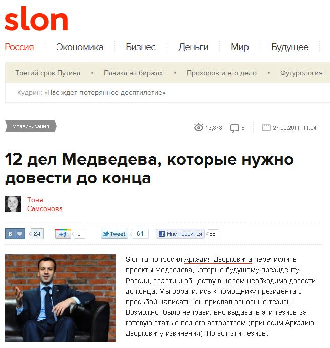 Аркадий Дворкович отрицает свою причастность к публикации на Slon.ruПомощник президента России через Twitter заявил, что не писал политическую статью «12 дел Медведева, которые должен доделать Путин»Сегодня утром на портале Slon.ru появилась статья под авторством Аркадия Дворковича «12 дел Медведева, которые должен доделать Путин». В настоящее время данная публикация «поменяла» своё авторство. Вместо Аркадия Дворковича теперь автором «12 дел Медведева» значится старший редактор Slon.ru Тоня Самсонова. Кроме того, статья немного изменила название («12 дел Медведева, которые нужно довести до конца») и содержание, к которому добавилось предисловие с сообщением о том, что портал «попросил Аркадия Дворковича перечислить проекты Медведева, которые будущему президенту России необходимо довести до конца. Мы обратились к помощнику президента с просьбой написать, он прислал основные тезисы. Возможно, было неправильно выдавать эти тезисы за готовую статью (приносим Аркадию Дворковичу извинения)». В статье говорится о том, что необходимо будет сделать Владимиру Путину, если он снова станет президентом: модернизировать экономику, оказывать противодействие коррупции, осуществлять приоритетные национальные проекты, а также новые международные инициативы. Однако помощник президента свою причастность к колонке отрицает. «Для slon.ru я ничего не писал, "12 дел..." - компиляция из разных источников. Будьте аккуратнее», - отмечает Дворкович в Twitter. |