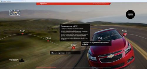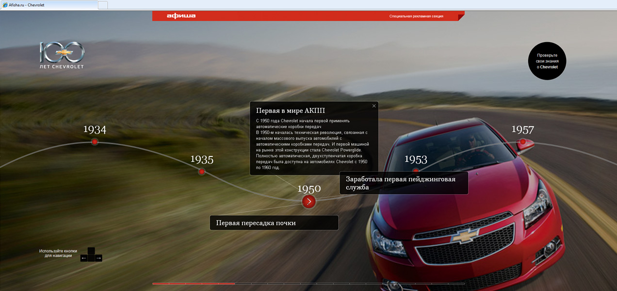 AdWatch Isobar и Chevrolet ведут урок истории на Afisha.ruАгентство реализует специальный проект, посвященный 100-летию бренда ChevroletПолносервисное digital-агентство AdWatch Isobar проводит специальный проект "Уроки истории от Chevrolet" для клиента General Motors на веб-сайте Afisha.ru. 3 ноября 2011 года бренд Chevrolet отметит свое 100-летие. Для анонсирования этой знаменательной даты команда агентства AdWatch Isobar предложила нестандартное размещение на популярном веб-сайте о досуге Afisha.ru, которое позволило рассказать об истории бренда. 7 сентября кампания стартовала по адресу Chevrolet.afisha.ru. Визуально страница специального проекта представляет собой линию времени, на которой в хронологическом порядке отражены различные события из истории кинематографа, музыки, жизни общества, а также создания и развития марки Chevrolet. Помимо путешествия по вехам истории на странице проекта пользователю предлагается пройти тест, чтобы проверить полученные знания о марке автомобиля. После ответа на вопросы свой результат можно опубликовать в социальных сетях. Для информирования пользователей о проекте на всех страницах веб-сайта Afisha.ru размещены анонсирующие баннеры. C момента старта проекта более 470 пользователей приняли участие в викторине, было зафиксировано более 10 тысяч просмотров промо-страницы Chevrolet. Кампания продлится до 7 октября 2011 года. "Для анонсирования в Интернете важных для бренда событий выбор специального проекта - хорошее стратегическое решение. Нестандартное размещение дает широкие возможности для взаимодействия с аудиторией и позволяет наилучшим образом донести до потребителя информативную составляющую кампании, - комментирует Андрей Молев, коммерческий директор агентства AdWatch Isobar. - Проект, анонсирующий 100-летие Chevrolet, получился ярким и запоминающимся и отлично смотрится на площадке Afisha.ru, которая отличается качественным контентом".