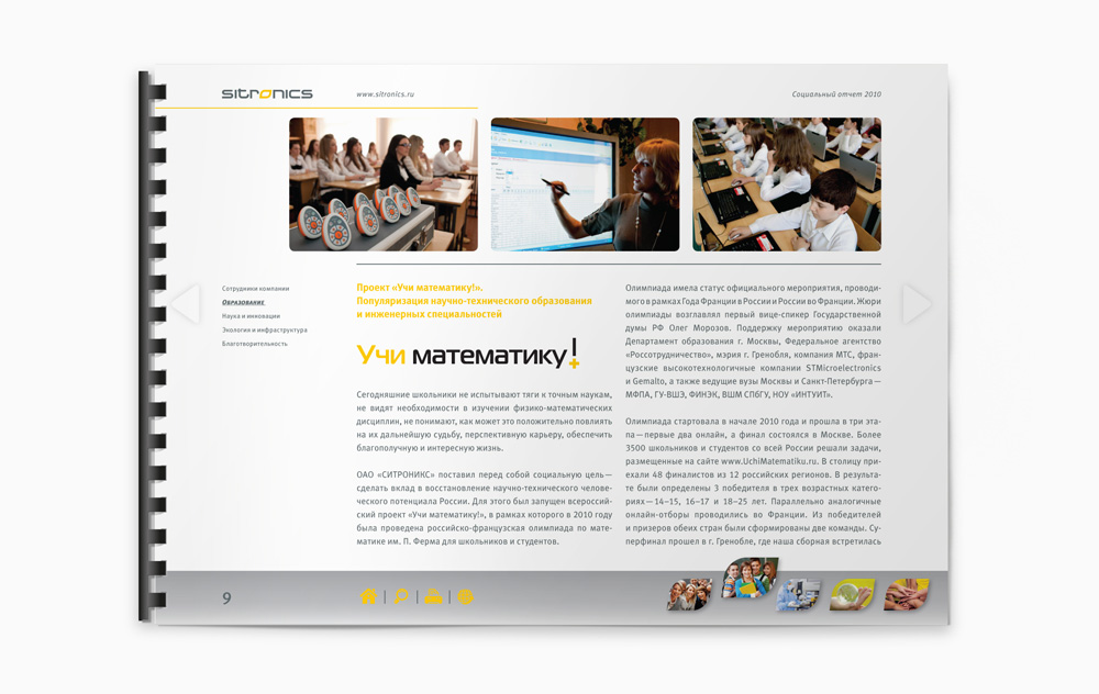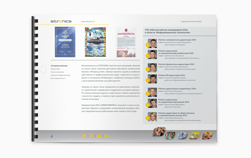 Интерактивные отчеты Sitronics от Graphic ProductionsКомпания Sitronics второй год подряд доверяет оформление отчетности агентству Graphic Productions | Corporate Branding. Sitronics -высокотехнологичная компания, работающая в сфере телекоммуникационных решений, информационных технологий и микроэлектронной продукции. По результатам 2010 года для Sitronics были созданы годовой и социальный отчеты. Публикация последнего намечена на 30 сентября. Интерактивная форма отчетности позволяет использовать широкие навигационные возможности, что повышает скорость получения требуемой информации и упрощает работу с документом. На страницах отчетов отражены достижения и ценности компании. |