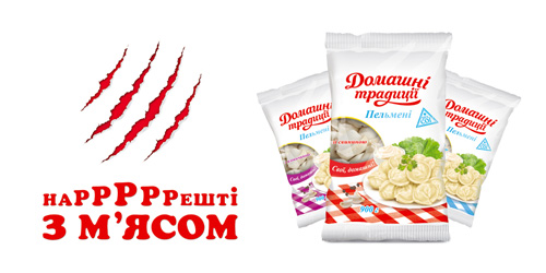 Наконец-то с мясом!Агентство PRAKTIKA выводит на рынок ТМ "Домашние традиции"Ситуация на продуктовом рынке Украины такова, что настоящее мясо является определенным трофеем в охоте на качественные продукты. Поэтому акцент кампании по выводу на рынок новых пельменей, сделан на главном сообщении: "Наконец-то появились пельмени с мясом". В рамках рекламной кампании созданы: ТВ- ролик, принты для наружной рекламы, макеты для оформления мест продажи.