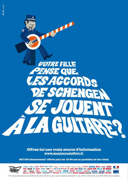Серия принтов, запущенная в рамках кампании задает вопросы с использованием игры слов родителям: Votre fille pense que les accords schengen se jouent a la guitar? ("Ваша дочь думает, что Шенгенское соглашение и игра на гитаре - это одно и то же?) и Votre fils pense que Francis Bacon est le roi du petit dejeuner? ("Ваш сын думает, что Фрэнсис Бэкон - это часть завтрака?")