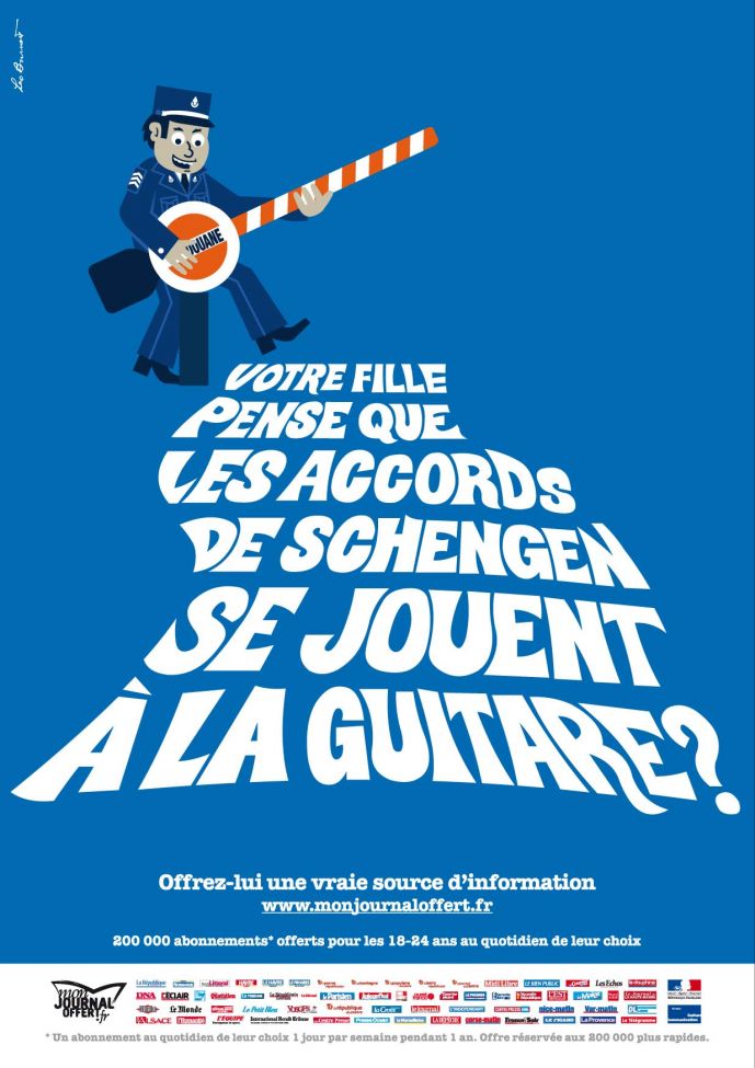 Министерство культуры и массовых коммуникаций Франции совместно с тремя союзами ежедневной прессы запустили рекламную кампанию Mon journal offert("Моя бесплатная газета"). Над серией принтов, созданных в рамках проекта, работало креативное агентство Leo Burnett France.
