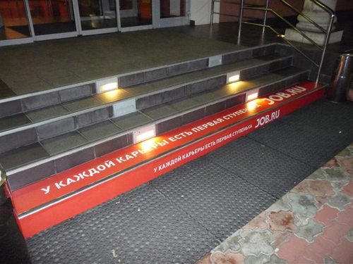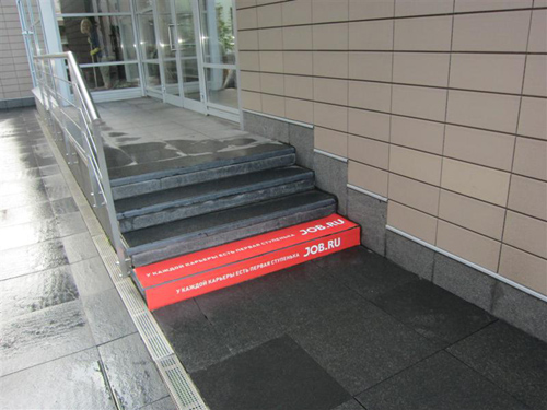 Starlink нарисовали ступени карьеры для job.ruВ качестве рекламного носителя были использованы ступени и лифты ВУЗов и бизнес-центровВ сентябре – ноябре этого года в Москве, Санкт-Петербурге, Казани, Краснодаре, Новосибирске, Ростове-на-Дону, Самаре, Нижним Новгороде, Красноярске, Воронеже, Владивостоке, Иркутске, Хабаровске, Туле проходит нестандартная рекламная кампания одного из ведущих российских порталов по трудоустройству Job.ru (компания «Пронто Москва»). Сегодня внимание потребителя все сложнее завоевать, используя стандартные ATL каналы. Для качественного контакта все больше используются Ambient медиа, охватывающие специфические области среды, в которых проживает целевая аудитория, и учитывающие атмосферу этих областей. Рекламными носителями для продвижения портала Job.ru стали первые ступени лестниц бизнес-центров и ВУЗов, на которых было размещено сообщение: «У каждой карьеры есть первая ступенька. Job.ru». Такое жизнеутверждающее высказывание на первых ступеньках карьерной лестницы способно найти отклик у многих соискателей. Также, в рекламной кампании задействовано пространство рядом с кнопками в лифтах бизнес-центров: «Чтобы подняться на вершину карьеры, не обязательно пользоваться лестницей. Job. ru». И ведь действительно! Для того чтобы начать карьеру, нам всегда нужно сделать первый шаг навстречу к успеху и ни в коем случае не останавливаться, стремясь всегда вверх и только вперёд! Ведь каждый наш предыдущий шаг, даёт нам возможность сделать следующий. Идею Ambient-рекламы для Job.ru реализовало агентство Starlink/MediaWays (VivaKi Russia). |