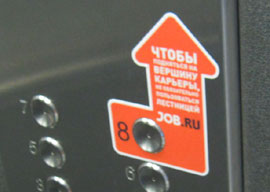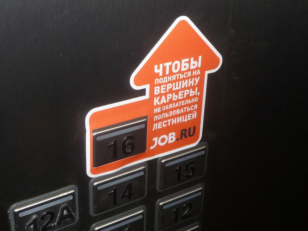 Также, в рекламной кампании задействовано пространство рядом с кнопками в лифтах бизнес-центров: «Чтобы подняться на вершину карьеры, не обязательно пользоваться лестницей. Job. ru».