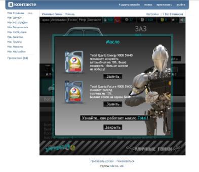 One Agile организовало «уличные гонки» с маслом TotalАгентство интегрировало моторное масло в олайн-игру в социальной сети Vkontakte.ruНа начальном этапе Digital агентство полного цикла One agile разработало концепцию интеграции моторного масла Total в популярную игру "Уличные гонки" в социальной сети Vkontakte.ru. Следующим шагом было создание креативной идеи кампании, разработка дизайн-элементов игры, дизайн "винилов" и разработка продуктовой корзины. В результате в игре появилась дополнительная брендированная механику - заливка масла в автомобиль и получение игроком дополнительных бонусов, в зависимости от типов выбранного масла. Кроме этого, в игре внедрены брендированные страницы, рассказывающие о характеристиках товара. Таким образом, агентство One Agile разработало и запустило нестандартную рекламную кампанию по повышению уровня узнаваемости торговой марки Total - производителя смазочных материалов, среди молодой аудитории. Как показывает практика, в настоящее время очень важно не просто привлечь внимание целевой аудитории, но вовлечь ее в процесс общения с маркой, побудить к действию, заинтересовать, что, несомненно, гораздо эффективнее отражается на уровне узнаваемости и повышает лояльность к бренду, особенно среди молодежной аудитории - прокомментировал Александр Пухов, генеральный директор One agile. Интегрированное приложение в игру "Уличные гонки" на портале социальной сети Vkontakte.ru доступно с 1 октября 2011 года.