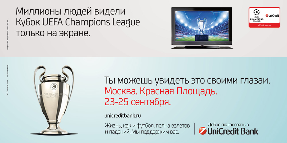 Банк Unicredit запустил первую российскую рекламу в рамках нового позиционированияКредитная организация стремится быть "банком для жизни"Российское отделение банка Unicredit запустило первую рекламную кампанию в рамках глобального перепозиционирования этой кредитной организации. Российской адаптацией глобального креатива занимались агентства Sauce и M&CSaatchi. Глобальную идею для всей группы "ЮниКредит" разработало известное британское агентство Bartle Bogle Hegarty. Парnнером "ЮниКредит Банка" в размещении является агентство "Медиаком" (это глобальный провайдер Группы ЮниКредит). "До недавних пор, в посткризисных условиях ЮниКредит Банк в основном продвигал рекламу розничных продуктов, это, скорее, был тренд всего рынка в ситуации сокращения бюджетов и необходимости роста продаж", - сообщила Sostav.ru Лаура Андронова, начальник управления корпоративного имиджа и коммуникаций ЮниКредит Банка. - Реклама, как правило, содержала прямые месседжи, четкую коммуникацию преимуществ того или иного продукта. Новое позиционирование бренда было введено в конце 2010 - начале 2011 года, и заключается оно в том, что мы как финансовый институт должны отталкиваться от реальных нужд и потребностей клиента, быть Банком для жизни (real life banking). Опыт последних нескольких лет наглядно демонстрирует, что любой, даже самый успешный бизнес, не может существовать в отрыве от действительности - а времена бывают разные. Отсюда, собственно и появилась новая рекламная концепция, что Банк для жизни должен быть готов предложить решения клиенту как в хорошие времена, так и в непростых условиях: Life is full of ups & downs. We are there for both. (Жизнь полна взлетов и падений. Мы поддержим вас". - В зависимости от типа рекламы целевой аудиторией рекламной кампании были розничные клиенты и клиенты Private Banking. И в принципе население Москвы и Петербурга, поскольку ЮниКредит ведет общеимиджевые кампании по двум большим проектам. Первая - это турне Кубка Лиги Чемпионов UEFA в сентябре в обеих столицах и Выставка "Люди и Город" - в ЦСИ ВИНЗАВОД с 21 октября по 4 декабря. Ключевая мысль концепции заключается в том , что банк готов предложить клиенту различные решения в разные моменты его жизни - это задача любого банка. Особенно это важно в непростых ситуациях, что наглядно показали события 2008 года. То есть это стремление банка понять реальные потребности клиента и выйти с нужным продуктом, предложением. Это в принципе полностью соответствует позиционированию бренда ЮниКредит как Банка для жизни (real-life banking). Кратко - это суть того, что мы хотим донести до аудитории нашей рекламой.