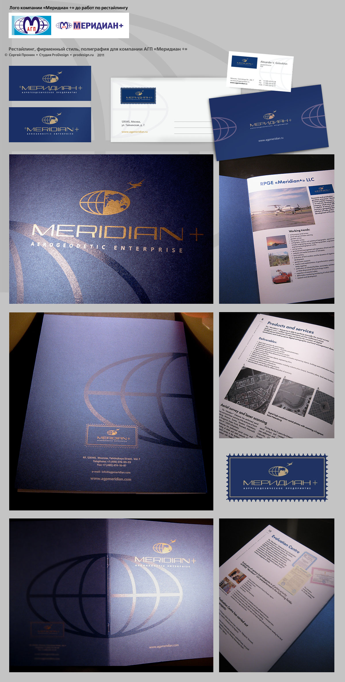 Студия ProDesign разработала фирменный стиль и буклет для компании "Меридиан+"Студия ProDesign разработала фирменный стиль для компании «Меридиан+»Рестайлинг был запланирован к третьей Международной конференции "Инновационные технологии сбора и обработки геопространственных данных для управления природными ресурсами". Старый лого не выдерживал никакой критики, тем не менее, часть элементов необходимо было сохранить: это глобус и самолет. Глобус, как один из самых распространенных символов, в нашем случае получил оригинальный и уместный вид за счет простого и подходящего графического решения. Половина изображения решена схематично, а половина - с изображением континентов. Это как нельзя лучше отражает сферу деятельности компании: аэрофотосъемка, аэрогеодезические исследования и пр. Для логотипа разработано оригинальное шрифтовое начертание на двух языках. Перечень корпоративной полиграфии включает: визитки, конверты, наклейки, буклет. Обложка буклета: дизайнерский картон с едва уловимым искрящимся эффектом. Вкупе с золотым пантоном лого и выборочной лакировкой получилось очень привлекательное корпоративное издание. "Спасибо за работу, лого и каталоги получились отличные! Наша компания приняла участие в международном мероприятиями и даже получила приз за оформление", - говорит Елена Климова, начальник отдела маркетинга компании "Меридиан+"