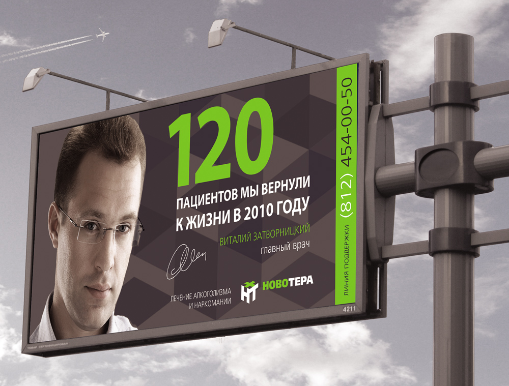 DDC Creative Lab разработала фирменный стиль и рекламу медцентра «Новотера»Она отражает фактические результаты деятельности клиникиАгентство DDC Creative Lab разработало концепцию позиционирования, фирменный стиль и рекламную кампанию для центра лечения алкогольной и наркотической зависимости "Новотера". Айдентика и рекламные сообщения должны были отражать основательность, социальную направленность, результативность и оперативность работы центра. Название центра образовано из слов "новая" и "терапия". Фирменный стиль устойчивый, серьезный и веский по тону. Характерные элементы визуальной айдентики - глубокая, достаточно напряженная цветовая гамма с контрастыми акцентами, строгая прямолинейная графика и объемные геометрические паттерны. Рекламные сообщения эмоционально сдержанные, построены на портретах врачей клиники и отображении фактических количественных результатов деятельности центра. Состав творческой группы:
