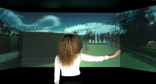 Прогулкой по Парку можно управлять жестами рук. Во время виртуальной экскурсии посетитель интерактивного павильона может остановиться в любом месте Парка и внимательно рассмотреть будущие здания и аттракционы. Принципиальное отличие собственного программного обеспечения United 3D Labs заключается в том, что, в отличие от большинства аналогичных систем, сенсоры автоматически распознают вошедших в зону действия людей. Визуализация Парка Приключений - один из крупнейших проектов в истории российской архитектурной визуализации. Более 50 гектаров, 8 локаций с высокой степенью детализации. Уникальность заключается в том, что в отличие от привычных технологий визуализации, когда создаются 3D модели, и затем анимируется виртуальная камера, при создании виртуального Парка специалисты United 3D Labs использовали игровой движок. По сути, каждая часть Парка является "уровнем" в игре. Здесь у зрителя есть возможность самостоятельно принимать решение, куда пойти и что смотреть. Изображение с помощью системы обратной проекции демонстрируется на трех больших экранах, окружающих зрителя со всех сторон и создающих полное ощущение погружения в виртуальное пространство. Угол обзора 240 градусов. Посетитель, совершающий прогулку, в буквальном смысле слова находится в центре событий. Технология, в чем-то аналогичная кинотеатрам IMAX, но не требующая специального помещения и оборудования огромной стоимости. При этом, площадь интерактивного павильона составляет всего 60 квадратных метров.