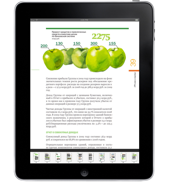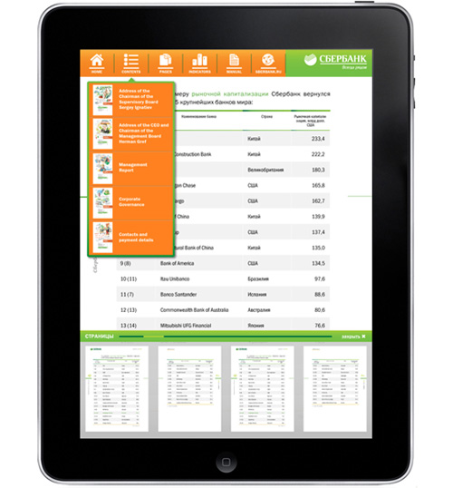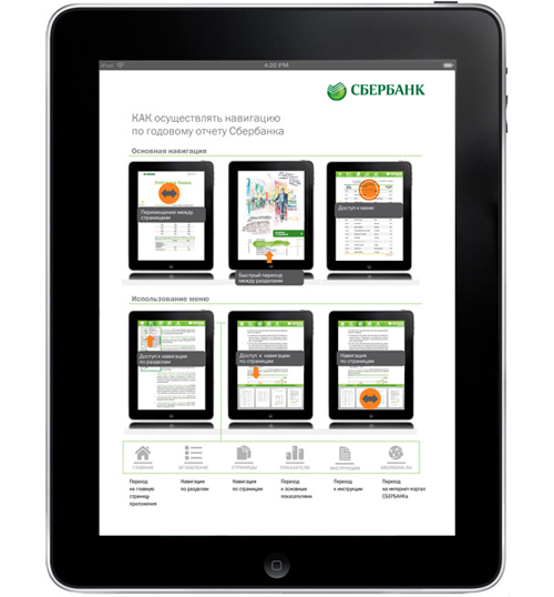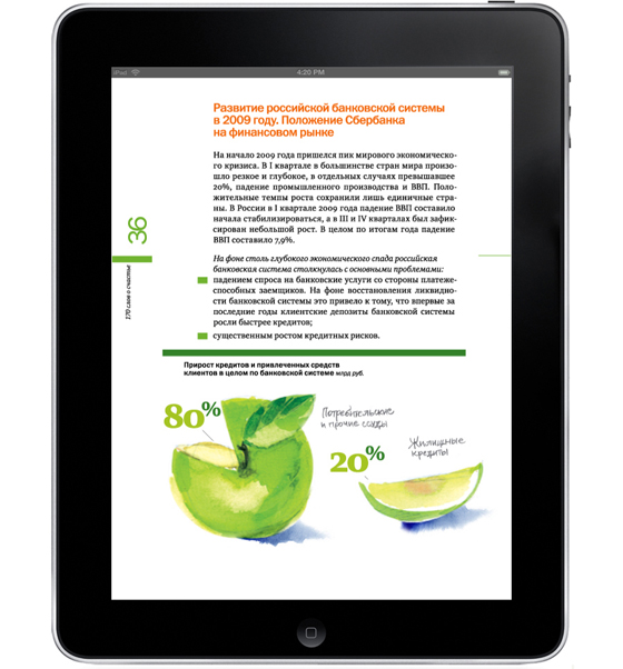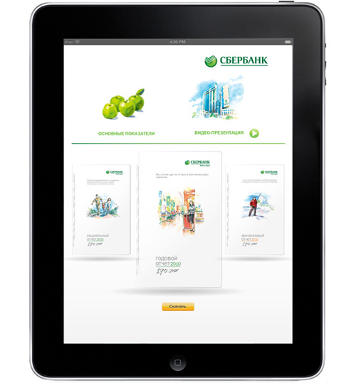 «Сбербанку» сделали годовой отчет для iPadСтудия "ДизайнДепо" разработала концепцию и дизайн юбилейного годового отчёта "Сбербанка РФ", посвящённого 170-летию компанииСтудия "ДизайнДепо" разработала концепцию и дизайн юбилейного годового отчёта "Сбербанка РФ", посвящённого 170-летию компании. Отчёт выпущен в трёх версиях: кроме привычного полиграфического издания и PDF-документа для размещения на сайте была разработана интерактивная версия отчёта в виде специального бесплатного приложения к iPad. Бесплатное приложение уже сейчас доступно для скачивания на Itunes App store. IPad-версия позволяет получить всю нужную информацию в удобном для пользователя виде и имеет несколько фундаментальных отличий, которые невозможно реализовать в других версия. |