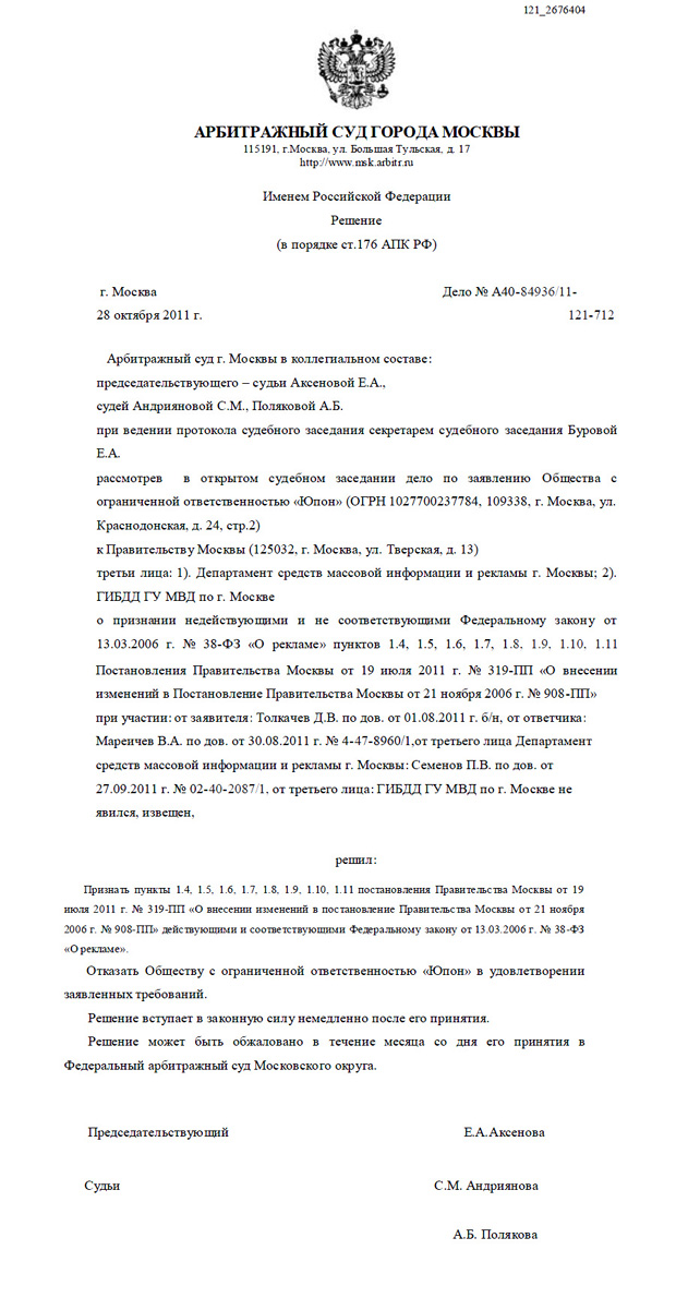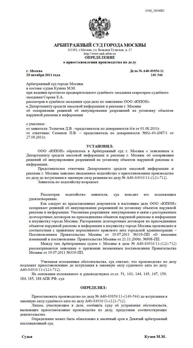 Напомним, что речь идет о запрете на размещение транспарантов-перетяжек. По мнению властей, они нарушают архитектурный облик города и безопасность дорожного движения. Летом власти в установленном порядке расторгли долгосрочные договоры с рекламными агентствами, а также аннулировали разрешения на установку объектов наружной рекламы и информации. Владельцам рекламных конструкций дважды были направлены требования о необходимости удаления рекламной информации в трехдневный срок и демонтаже рекламной конструкции в месячный срок. В августе были демонтированы все перетяжки на территории города. При этом срезались только полотнища с рекламной информацией, а тросы и крепления оставались нетронутыми. Недавно столичные власти объявили тендер на демонтаж оставшихся конструкций. На момент запрета «Юпон» принадлежало 230 перетяжек. В августе компания, как и ряд московских рекламных операторов, обратилась в суд. Операторы настаивали на том, что у них имеется разрешительная документация, а в договорах прописаны сроки действия. Они требовали отменить аннулирование разрешений на установку объектов наружной рекламы и оставить перетяжки на месте, пока не закончатся действующие контракты. «Юпон» подала два иска – к правительству Москвы и департаменту СМИ и рекламы. Кроме того, арбитраж получил иски от «Мосгоррекламы», «Столицы-М», «Единого города-1», «Виатры», «Магистраль-Сити», «Домино-С» и «Юсти-Класс». 20 октября арбитраж приостановил производство по делу «Юпона» и департамента СМИ и рекламы – до тех пор, пока суд не вынесет решение по спору с правительством Москвы. Как пишет газета «Коммерсант», в суде представитель «Юпона» предъявил основной довод: у правительства Москвы нет полномочий запрещать отдельный тип рекламных конструкций. Истец напомнил, что, согласно ст. 4 закона «О рекламе» изменить правила размещения и распространения рекламы могут только федеральные законы, акты президента и правительства РФ, но никак не ее субъекта. Юрист правительства Москвы возражал: «Закон "О рекламе" наделяет нас полномочиями по выдаче разрешений и по признанию их недействительными. Пусть там говорится про конкретные выданные разрешения, но правительство Москвы распространило это на неопределенный круг лиц». Ответчик также обратил внимание, что перетяжки создают угрозу безопасности дорожного движения: с сентября 2009 года отраслевой ГОСТ для наружной рекламы запрещает размещение этих конструкций над проезжей частью. На это представитель «Юпона» заметил, что перетяжки размещаются не только над проезжей частью, но и, например, в парках, где нет дорожного движения. Сергей Субботин, гендиректор группы CityText, в которую входит «Юпон», не исключает апелляции. Столичный департамент СМИ и рекламы удовлетворен решением арбитражного суда Москвы, заявил его пресс-секретарь. Ранее на сторону операторов наружной рекламы встал прокурор Москвы Сергей Куденеев. В сентябре он признал запрет на размещение рекламы на строительных сетках, заборах, фасадах зданий и транспарантах-перетяжках противоречащим федеральному законодательству и выдал представление мэру Сергею Собянину в месячный срок устранить нарушения. Через две недели прокурор отозвал свое представление «в связи с дополнительной проработкой вопроса».