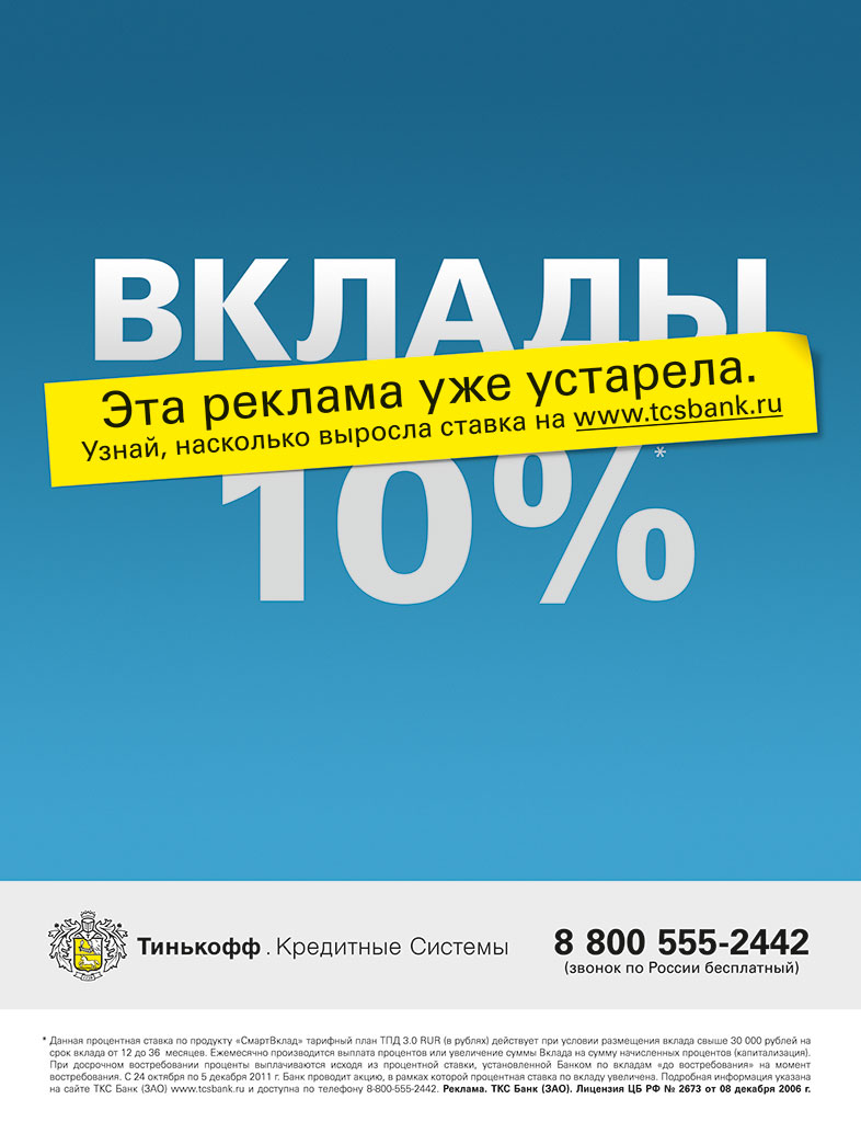 Тиньков снял для «ТКС-банка» ролик за 100 евроАгентство Practica разработало рекламную кампанию для смарт-вкладов банка «Тинькофф. Кредитные системы»«ТКС-банк» запустил рекламную кампанию, посвященную увеличению ставки по депозитам до 11%. Креатив разработан агентством Practica. Реклама рассказывает о том, что «ТКС банк» может оперативно реагировать на рыночные изменения благодаря модели ведения бизнеса. Банк не имеет отделений, приток клиентов обеспечивается через сайт банка и колл-центр. Поэтому руководство банка имеет возможность менять условия по вкладам максимально быстро – так быстро, что наружная реклама в рамках текущего флайта не успевает фиксировать эти изменения. Интегрированная кампания включает в себя наружную, печатную рекламу, радио- и видеоролик. «По-моему как и все, что мы делаем - гениально!)) Ролик снят in-house, актёры мы, стоимость 100 евро. Идея Рустама Салимзянова из агенства "Практика"», - пишет Олег Тиньков в своем блоге. «Пока другие банки ищут мифические «инновационно-интерактивные медиа», ТКС банк спокойно настраивает под себя традиционные носители. Возможности in-house-студии позволяют им в разы сократить сроки производства, создавая коммуникацию практически в режиме реального времени», - говорит Рустам Салимзянов, управляющий партнер агентства Practica. Предыдущая рекламная кампания «ТКС-банка» проходила в Интернете. Видео «Дальше действовать будем мы» набрало около двух миллионов просмотров.