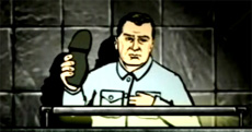 Посредством стука башмаком о трибуну ООН анимационный лидер ЛДПР рассказывает о том, что он не даст грабить Россию.