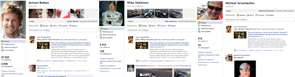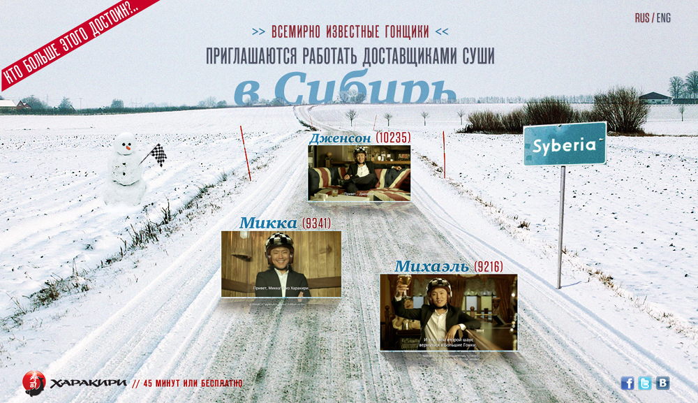 Мике Хаккинену, Михаэлю Шумахеру и Баттону Дженсону предложили доставлять суши в СибириС этим смелым предложением выступило агентство SLAVA в интересах компании «Харакири»Агентство SLAVA сделало рекламу для компании «Харакири», которая занимается доставкой суши в Новосибирске и Екатеринбурге. В сети были размещены видео, в которых великих пилотов «Формулы-1» приглашают поработать доставщиками суши в Сибири. В качестве адресатов послания выступили Мика Хаккинен, Михаэль Шумахер и Батон Дженсон. Ссылки на видео были опубликованы на официальных Facebook и Twitter гонщиков. «Мы доставляем суши за 45 минут или бесплатно. Это очень быстро. Поэтому на вакансии доставщиков нам нужны по-настоящему быстрые люди», говорят в «Харакири». Клиентам «Харакири» так же предложено проголосовать за того гонщика, которого они хотели бы видеть доставщиком, на странице job.xarakiri.ru. О реакции пилотов «Формулы-1» на это смелое предложение пока ничего не известно. Предыдущая работа SLAVA была посвящена рекламы литературного фестиваля «Букмаркет». Реклама для компании «Харакири». Jenson (Батон Дженсон) Реклама для компании «Харакири». Michael (Михаэль Шумахер) Реклама для компании «Харакири». Mikka (Мика Хаккинен)
