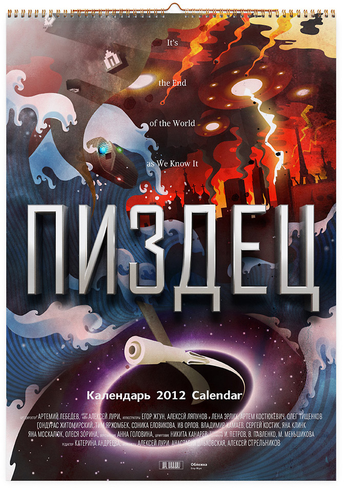 Студия Лебедева разработала календарь «П..дец»Работа демонстрирует сценарии грядущего конца светаСтудия Лебедева разработала календарь на 2012 год под названием «П..дец» «Как известно, в 2012-м году наступит конец света, - сообщают авторы работы - В календаре «П..дец» на каждый месяц приходится по сценарию конца света — на любой вкус. Разные иллюстраторы придумали двенадцать способов уничтожить человечество и воплотили задуманное в своем стиле. Календарь «П..дец» — лучший подарок на Новый год. «П..дец» будет актуален каждый день 2012-го года, его никогда не выкинут, он никогда не потеряет в цене. Календарь «П..дец» украсит любую стену в офисе и дома — леденящие душу картины апокалипсиса выполнены в формате A2 на отличной глянцевой бумаге. Предыдущая работа студии Лебедева – редизайн сайта банка «ТРАСТ».