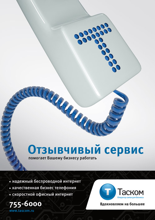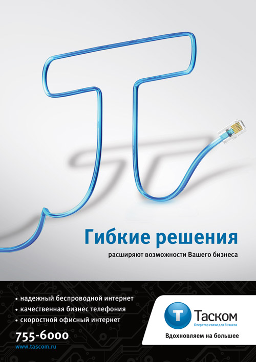«Таском» представил рекламу со шнуромКреатив разработан агентством GLOBAL PointВ начале ноября стартует имиджевая рекламная кампания телекоммуникационного оператора "Таском". Специально для "Таском" коммуникационное агентство GLOBAL Point разработало оригинальную концепцию рекламных макетов, в которых ключевой фигурой выступает буква "Т", вызывающая прямую ассоциацию с логотипом компании. Разработанные макеты призваны рассказать корпоративным клиентам о преимуществах сотрудничества с "Таском", сильных сторонах компании, а также о выгодах, которые смогут получить клиенты, выбрав "Таском" в качестве провайдера услуг связи. Рекламная кампания задействует наружную рекламу в городе Москве, а также Интернет-баннеры на порталах ведущих российских СМИ. "Основная задача рекламной кампании - повысить известность компании "Таском" среди широкой бизнес-аудитории и выделить бренд на рынке телекоммуникаций, - комментирует Екатерина Ратникова, руководитель службы маркетинга ЗАО "Таском".. - Мы сделали акцент на продвижении через наружную рекламу и Интернет, что позволит донести ценности бренда - гибкость, динамичность, открытость - до большого числа наших потенциальных клиентов в короткие сроки. В основе кампании - слоган "Вдохновляем на большее", который отражает проактивную сервисную философию бренда по отношению к своим клиентам: индивидуальный подход к клиенту и его задачам, высококачественный клиентский сервис, оперативность решения проблем и проведения работ. Гибкость решений, обеспечиваемых компанией, отражена в тактическом лайне кампании".