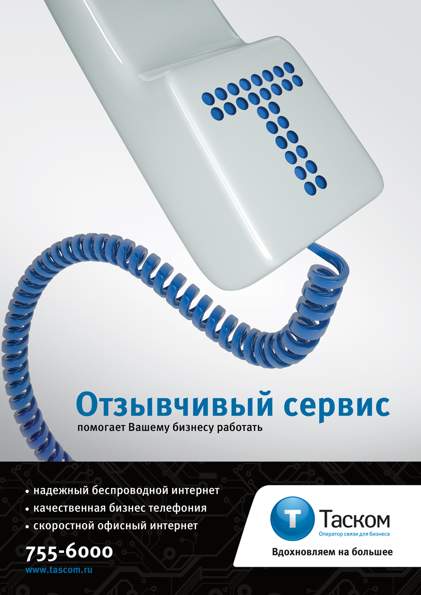 «Таском» представил рекламу со шнуромКреатив разработан агентством GLOBAL PointВ начале ноября стартует имиджевая рекламная кампания телекоммуникационного оператора "Таском". Специально для "Таском" коммуникационное агентство GLOBAL Point разработало оригинальную концепцию рекламных макетов, в которых ключевой фигурой выступает буква "Т", вызывающая прямую ассоциацию с логотипом компании. Разработанные макеты призваны рассказать корпоративным клиентам о преимуществах сотрудничества с "Таском", сильных сторонах компании, а также о выгодах, которые смогут получить клиенты, выбрав "Таском" в качестве провайдера услуг связи. Рекламная кампания задействует наружную рекламу в городе Москве, а также Интернет-баннеры на порталах ведущих российских СМИ. "Основная задача рекламной кампании - повысить известность компании "Таском" среди широкой бизнес-аудитории и выделить бренд на рынке телекоммуникаций, - комментирует Екатерина Ратникова, руководитель службы маркетинга ЗАО "Таском".. - Мы сделали акцент на продвижении через наружную рекламу и Интернет, что позволит донести ценности бренда - гибкость, динамичность, открытость - до большого числа наших потенциальных клиентов в короткие сроки. В основе кампании - слоган "Вдохновляем на большее", который отражает проактивную сервисную философию бренда по отношению к своим клиентам: индивидуальный подход к клиенту и его задачам, высококачественный клиентский сервис, оперативность решения проблем и проведения работ. Гибкость решений, обеспечиваемых компанией, отражена в тактическом лайне кампании".