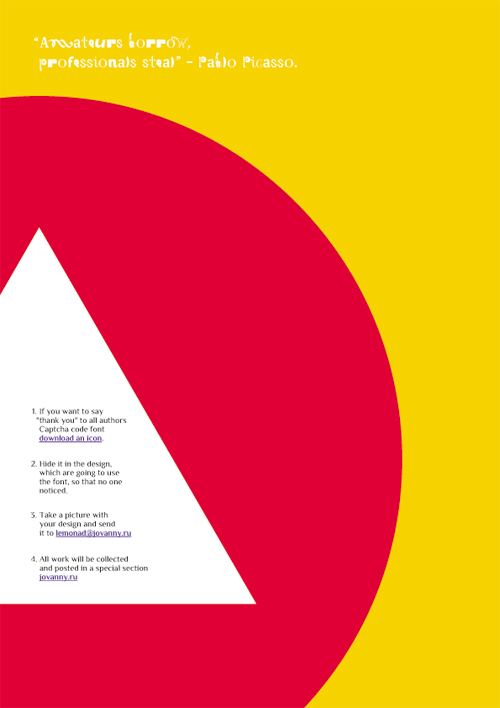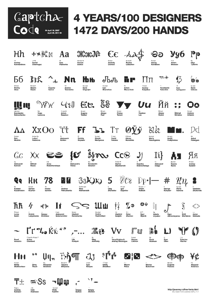 100 дизайнеров нарисовали акцидентный шрифтЖЖ-юзер neucha объявил о завершении проекта «1 шрифт и 150 рук»Инициатор проекта «1 шрифт и 150 рук» Иван Гладких объявил о завершении проекта «1 шрифт и 150 рук». Этот проект стартовал в жж 4 года назад. Его целью являлось создание акцидентного шрифта общими усилиями множества людей. Акцидентный шрифт - это "особый шрифт для особых целей", предназначенный для набора титульных листов, ярлыков, афиш, плакатов, а также для шрифтовых выделений. Принадлежность участников проекта к цеху дизайнеров не была обязательной. «Итоговый шрифт получился разнообразным, странным и интересным, говорит инициатор проекта - В нем приняло участие 100 дизайнеров (а это считайте 200 рук) из разных стран и городов. По сути, этот шрифт — банк идей для реализации творческого ступора. Каждый, у кого возникли проблемы с идеями, обязательно найдет что-нибудь для себя в Captcha Code. Шрифт бесплатный, скачать его можно на моем сайте и почитать о нем в моем блоге. Кроме этого, в архиве со шрифтом есть плакат, в котором можно увидеть всех авторов и их буквы». |