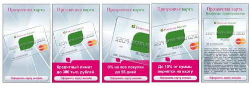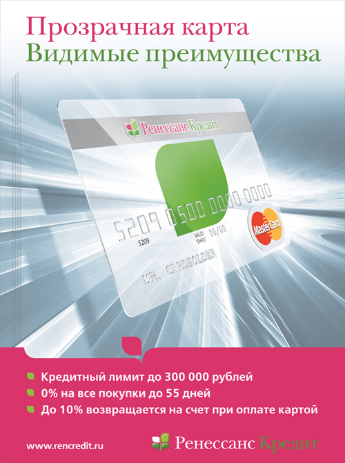 «Ренессанс Кредит» и Digital BBDO продемонстрировали прозрачность кредитных условийРекламная кампания обращает внимание на "прозрачность" банковского продукта при помощи дизайна кредитных карт"Ренессанс Кредит" начинает рекламную кампанию новой кредитной карты на платформе MasterCard. Разработку креативной концепции осуществляла команда "Ренессанс Кредита" и агентство Digital BBDO. Рекламная кампания стартовала 9 ноября в Интернете. Она охватит 12 городов России: Москву, Санкт-Петербург, Новосибирск, Екатеринбург, Нижний Новгород, Самару, Омск, Казань, Челябинск, Ростове-на-Дону, Уфу и Волгоград. В рекламной кампании будет использован анимированный баннер, выполненный в фирменном стиле и цветах "Ренессанс Кредит" с изображением самой карты и описанием основных преимуществ ее использования. Особенностью новой карты стал современный дизайн - карта выполнена из высокотехнологичного прозрачного пластика, символизирующего прозрачность условий кредитования, предлагаемых "Ренессанс Кредит". Видимые преимущества банковских продуктов, скорость оформления карты, качество предоставляемой клиентам информации - ключевые принципы, которыми руководствовался банк при разработке нового продукта. Карта ориентирована на социально активных потребителей, пользующихся Интернетом и уже знакомых с потребительским кредитованием. Одни из ключевых характеристик прозрачной карты - простота и удобство оформления. Достаточно заполнить заявку на сайте "Ренессанс кредит", и карта будет доставлена курьером в удобное время и место. Кроме того, предусмотрено дополнительное вознаграждение клиента: с каждой покупки, оплаченной с помощью прозрачной карты, на счет держателя возвращается часть суммы в размере от 1 до 10% по программе CashBack.