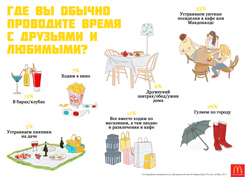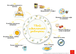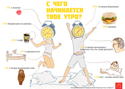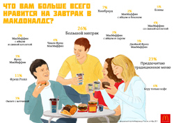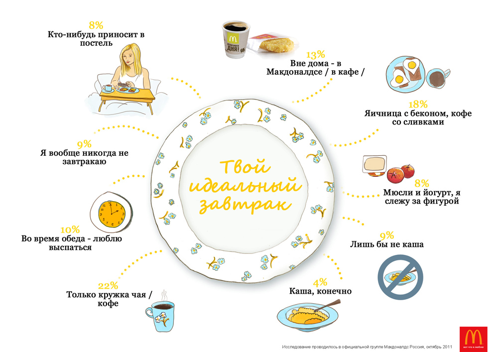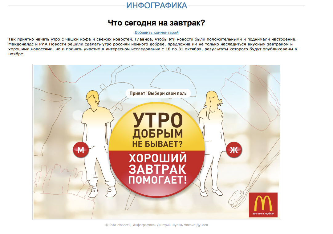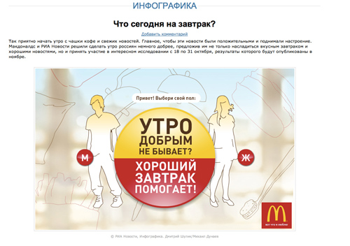 РИА Новости «исследовало» завтраки в McDonald'sОтдел инфографики агентства и сеть ресторанов быстрого питания выяснили, как начинается утро россиян"Макдоналдс" и DDB Россия разместили в Интернете рекламный тест. Целью рекламной кампании было рассказать о том, что завтраки в McDonald's - это правильный и простой путь для начала дня. Было выбрано два канала коммуникации: ТВ и Интернет. Для коммуникации в Интернете использовались спецпроекты на сайте РИА новости и социальной сети Vkontakte. РИА новости: Понимая занятость профессиональной аудитории, создатели рекламной кампании решили привлечь пользователей, предложив им пройти увлекательный тест на тяжесть утра, а затем, с помощью инфографики, наглядно рассказать о том, как именно проходит среднестатистичегоское утро россиян. Изюминкой теста была хорошая утренняя новость, подразумевалось, что хорошая информация дает положительные эмоции на целый день. Логика теста была очень простой: