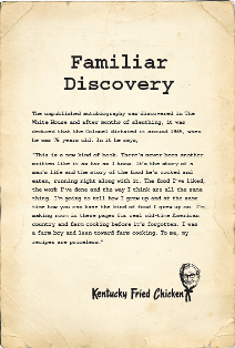 KFC Corporation сообщила об обнаружении неопубликованной "Кулинарной автобиографии" основателя компании - полковника Гарланда Сандерса, хранившуюся последние 40 лет в архиве компании в Луисвилле. Согласно легенде, рукопись книги была случайно обнаружена ветераном компании, проработавшим в ней более 30 лет. Оригинал "Кулинарной автобиографии" был помещен в хранилище KFC, рядом с секретным оригинальным рецептом, который сделал полковника знаменитым.
