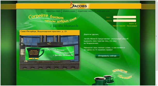 Jacobs Monarch сказал теплые слова с экранов городаАгентство предложило пользователям Интернета пожелать добра близким при помощи рекламных видеоэкранов в оффлайнеSapientNitro Москва разработали рекламную кампанию для кофе Jacobs Monarch, принадлежащего Kraft Foods Rus. Креативная задача заключалась в том, чтобы вдохновить людей и помочь им выразить свои чувства. Именно такую задачу поставил кофейный бренд Jacobs Monarch, объявив креативный питч на создание кампании в Интернете, которая в рамках поддержки бренда должна была дополнить его коммуникационную стратегию интересной активностью в 2011 году. В октябре на сайте www.jacobs-monarch.ru проводился конкурс "Скажи теплые слова". Пользователь, отправивший доброе послание для своих близких, мог выиграть один из 20 эксклюзивных подарочных наборов Jacobs Monarch с уникальным дизайном чашек от знаменитостей: семьи Елены и Дмитрия Маликовых и Екатерины и Александра Стриженовых. При создании рисунка чашек за основу была взята идея выражения чувств тем, кто нам особенно дорог и близок. В ноябре проект "Согрейте близких теплом добрых слов c Jacobs Monarch" с онлайн-трансляцией теплых слов стал логическим продолжением Интернет-кампании, предоставив возможность людям выразить свои чувства и наполнить город добрыми посланиями! На четырнадцати видеоэкранах в крупнейших городах России круглосуточно транслируются сообщения, отправляемые пользователями одним из трех способов - с сайта www.jacobs-monarch.ru, через СМС 2420 или c помощью приложения в Одноклассниках, Vkontakte или Facebook. Напротив каждого экрана установлена онлайн-видеокамера, трансляцию с которой в режиме реального времени можно видеть на сайте Jacobs Monarch. Эфирный поток идет без задержек, переключение между камерами происходит практически мгновенно. Участники отправляют свои тёплые слова, предварительно выбрав город, где будет транслироваться его сообщение. Спустя некоторое время им приходит уведомление о дате и времени показа сообщения. Пользователь может просмотреть его на сайте Jacobs Monarch, сохранить и отправить адресату, а также увидеть видеотрансляцию своих теплых слов. Уже в день старта было зарегистрировано несколько тысяч пользователей, и число участников растёт с каждым днём. Кампания "Согрейте близких теплом добрых слов с Jacobs Monarch" продлится до 30 ноября 2011 года. Состав творческой группы: Катя Шенец
