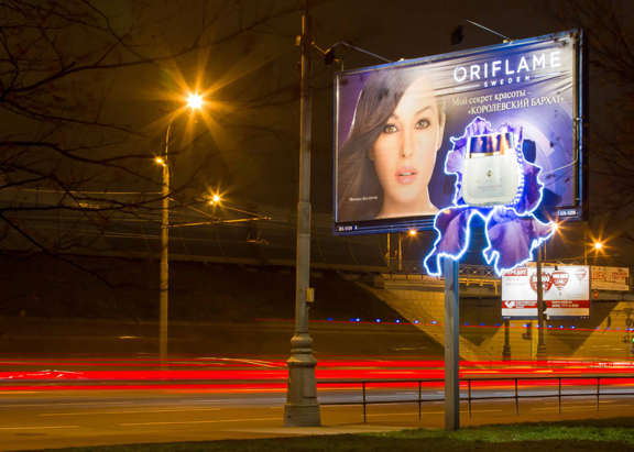 Моника Беллуччи раскрыла секреты красоты в наружной рекламе OriflameНестандартная кампания проходит на билбордах News Outdoor в столицеПоздней осенью на улицах Москвы распустились черные ирисы. Это произошло в рамках новой рекламной outdoor-кампании бренда Oriflame по продвижению серии антивозрастной косметики для женщин "Королевский бархат" с участием мировой звезды Моники Беллуччи. В рамках проекта реализовано нестандартное размещение на собственных поверхностях News Outdoor по заказу агентства Mindshare. Основная задача наружной кампании - максимально точно отразить на билбордах идею телевизионной рекламы. Для этого на щитах установлены сразу несколько видов экстендеров, добавляющих яркости и реалистичности outdoor-проекту. Объемный выносной элемент в форме цветка черного ириса, экстракт которого входит в состав косметической линии "Королевский бархат" от Oriflame, представляет собой многоуровневый экстендер. Он выполнен из армированного пластика с полноцветной печатью на металлокаркассе, лепестки по контуру имеют динамическую белую светодиодную подсветку. Плоский экстендер в виде флакона крема с контурной подсветкой также сделан из пластика. Он прикреплен к поверхности щита с небольшим отступом вперед. Технология "акрилайт", позволяющая подсвечивать отдельные элементы изображения на постере, акцентирует внимание на логотипе Oriflame. В уникальной кампании задействовано десять сторон 6х3 на основных магистралях города. Проект в наружной рекламе является частью масштабной рекламной кампании бренда, в которой так же задействовано телевидение и интернет. Разработка креатива осуществлялась командой Oriflame.