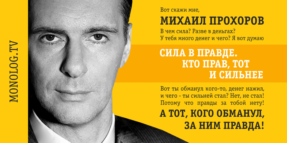Электорат еще долго будет помнить ставший знаменитым слоган «Сила в правде» (явная аллюзия на фильм «Брат-2»). Прежде его использовал другой персонаж – Евгений Ройзман. Билборды рекламировали не «Правое дело» как таковое, а проект Прохорова Made in Russia.