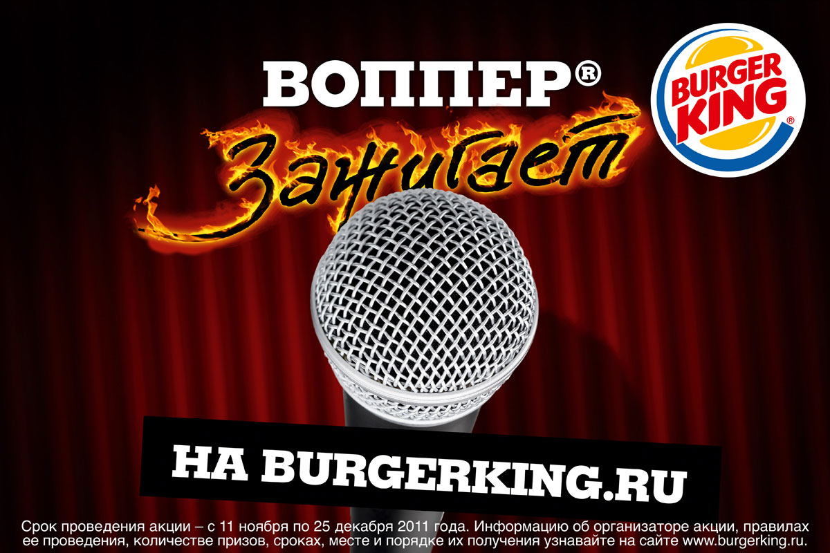 «Бургер Кинг» предпочел рекламу в рунетеПервая рекламная кампания бренда в России разработана McCann Erickson RussiaСеть ресторанов Бургер Кинг запускает свою первую рекламную кампанию в России. Главным героем кампании стал флагманский продукт сети – ВОППЕР. Главное отличие Воппера от многих конкурентных продуктов в том, что говядина для Воппера, как и для других бургеров в ресторанах Бургер Кинг, готовится на гриле. Целью кампании было подчеркнуть это преимущество, поэтому основным сообщением кампании стал слоган «Воппер зажигает!» Бургер Кинг предлагает молодым и талантливым зажечь вместе с Воппером. Для этого участники должны выполнить задания в социальных сетях Facebook.com, Вконтакте или на сайте Бургер Кинга (www.burgerking.ru ). Суть заданий – сочинить пару строк в стиле хип-хоп, сравнив Воппер с различными явлениями нашей жизни. Каждую неделю новое задание и новые победители. В завершении кампании пройдет большая вечеринка «Воппер зажигает!», на которой будет разыгран главный приз – поездка в Майами. Креатив для кампании разработало рекламное агентство McCann Erickson Russia. Под координацией агентства и в партнерстве с MRM Russia, UM, Momentum была запущена интегрированная кампания с использованием различных каналов коммуникации: Вирусный ролик, диджитал платформа в сети интернет, Интернет-баннеры, бннеры в метро, пресса, радио, реклама в ресторанах. Бургер Кинг - вирусный ролик Бургер Кинг: Сравни Воппер со сказкой Бургер Кинг: Сравни Воппер с грилем Бургер Кинг: Сравни Воппер с магией Бургер Кинг: Сравни Воппер с вечеринкой