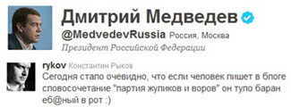 Twitter президента отметился нецензурным сообщениемРетвит, сделанный Дмитрием Медведевым, сразу же попал в тренды. Вину администрация возложила на сотрудникаЭтой ночью пользователи Twitter, читающие микроблог президента, увидели в ленте новостей нецензурный ретвит (продублированное сообщение). Дмитрий Медведев перепостил запись Константина Рыкова: «Сегодня стало очевидно, что если человек пишет в блоге словосочетание "партия жуликов и воров" он тупо баран еб@ный в рот :)» (орфография автора – Sostav.ru). Сообщение удалили через несколько минут, но его скриншоты распространились в сети. Как пишет журналист Александр Плющев, кэш от Google уже подчистили, но в кэше «Яндекса» публикация осталась. Константин Рыков – депутат Государственной Думы пятого созыва от партии «Единая Россия», а также генеральный продюсер «ИД Константина Рыкова», руководитель корпорации Newmedia Stars, владелец продюсерской компании Goodoo. Случившееся породило множество домыслов. Так, некоторые пользователи предположили, что ведет Twitter президента сам Рыков. При этом аккаунт Медведева имеет верификацию, что не отменяет версию о лице, ответственном за микроблог. Собственно слова про «баранов» произнес блогер Алексей Навальный на митинге в понедельник. Акция прошла на Чистых прудах и была посвящена итогам думских выборов. Между тем чиновники не скрывают, кто обеспечил победу «Единой России» на выборах 4 декабря. Министр обороны Анатолия Сердюков письменно отчитался о результатах голосования перед премьером Владимиром Путиным. В письме от 5 декабря министр докладывает, что явка по сравнению с 2007 годом выросла с 85% до 95,5%. В частности, на этот раз проголосовало 96,8% военнослужащих, 93,4% членов их семей, а также 94,6% гражданского персонала. Как следует из отчета, за «Единую Россию» проголосовало 80% военных, пишет «Коммерсант». Пресс-секретарь Путина Дмитрий Песков отрицает факт подобного отчета. |