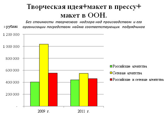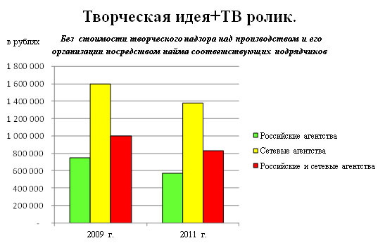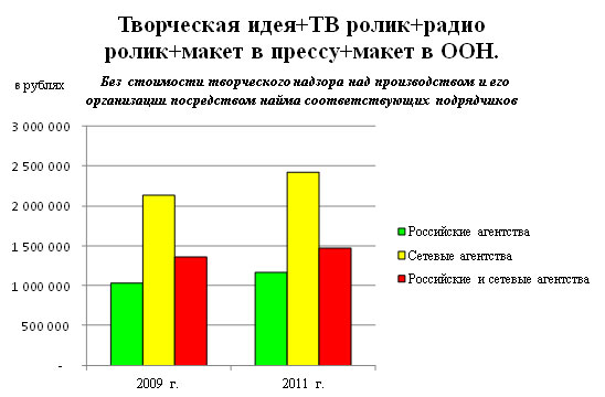 Креатив – 2011 обойдется в 2 миллиона рублейАКАР выяснила среднюю стоимость услуг креативного агентства в 2011 годуАссоциация Коммуникационных Агентств России провела ценовое исследование «Стоимость креативных услуг в рекламных агентствах», по итогам которого были выявлены средние показатели стоимости работы креативных агентств в 2011 году. В исследовании приняли участие 16 российских и 5 московских сетевых агентств, входящих в состав Ассоциации и осуществляющих свою деятельность на рынке коммерческих коммуникаций. Среди опрошенных респондентов генеральные директора и директора по развитию бизнеса. Согласно методологии, агентствам, изъявившим принять участие в исследовании, предлагалось на основании заранее подготовленного брифа оценить разработку творческой идеи и сценариев ТВ ролика как со стоимостью организации производства, так и без нее. Для анализа полученных данных был использован метод 5% Trimmed Mean или метод сбалансированного среднего (среднее арифметическое, посчитанное после того, как из анализа исключаются верхние и нижние 5% вариационного ряда), который не учитывает 5% самых высоких и 5% самых низких значений. Результаты исследования были представлены в виде средних значений стоимости услуг по российским и московским сетевым агентствам. Помимо этого в исследовании отражена динамика роста цен на креативные услуги в сравнении с 2009 годом, когда проводилось предыдущее подобное исследование. Средняя стоимость полномасштабной ATL-кампании, включающей в себя разработку творческой идеи и рекламных материалов для ТВ, радио, прессы и наружной рекламы, составила около 2 000 000 рублей без учета НДС: