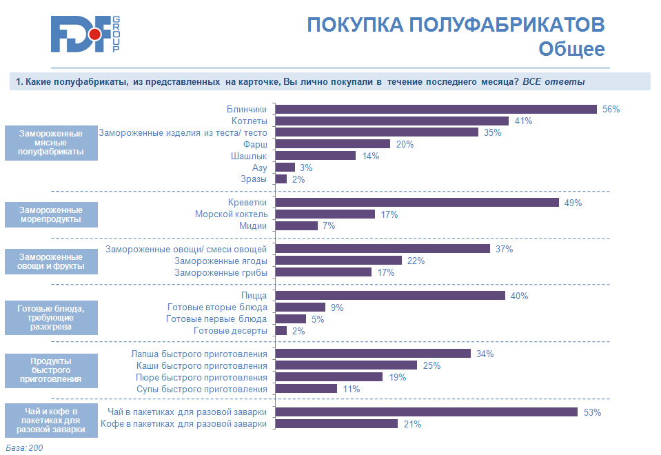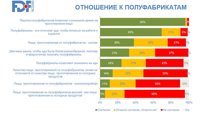 Согласно данным FDF Group, полуфабрикаты не стали основным видом пищи для большинства россиян. Чаще всего они являются дополнением к самостоятельно приготовленным блюдам: 47% опрошенных потребляют их 2-3 раза в неделю, в то время как самостоятельно приготовленная пища потребляется каждый день (71% несколько раз в день, 25% один раз в день). Более половины респондентов считают, что полуфабрикаты - это еда для дороги и работы. Некоторая часть опрошенных считает продукты быстрого приготовления более вкусными, чем приготовленные из исходных продуктов. Таких порядка 5%.