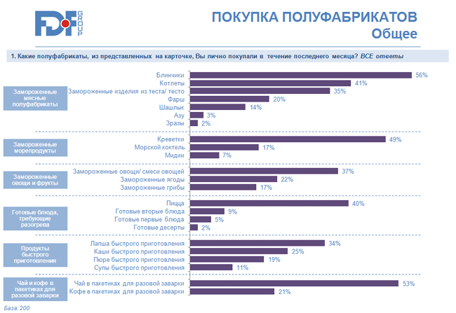 По результатам исследования FDF Group, проведенного специально для Sostav.ru, можно сделать вывод, что популярность полуфабрикатов у посткризисного потребителя не снизилась, при этом спрос на приготовленную в домашних условиях пищу по-прежнему преобладает.