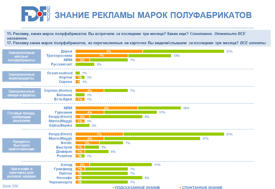 Что касается готовых блюд, то здесь уровень знания брендов на среднем уровне, лучше известны зонтичные бренды, рекламная поддержка достаточно активная. Наиболее известные марки – «Магги» (35%) и «Кнорр» (25%). Лояльность к «новым» брендам значительно выше, чем к существующим давно.