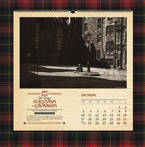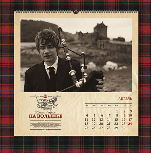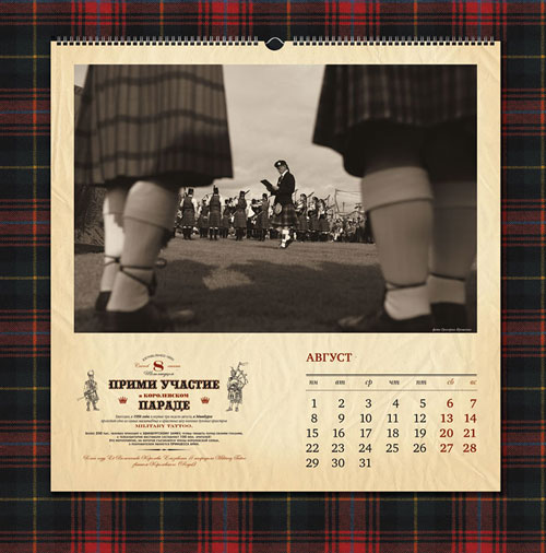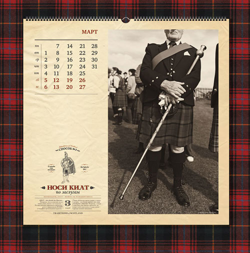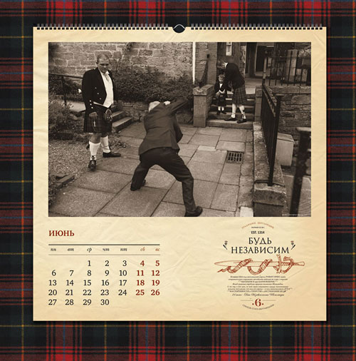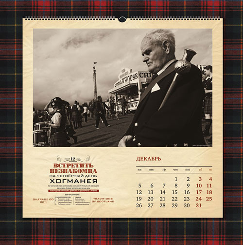 «Фронт:Дизайн» рассказал о 12 способах стать шотландцемАгентство опубликовало календарь компании Oil TradeКаждый год, компания Oil Trade, официальный дистрибьютор ExxonMobil, представляет своим деловым партнерам очередной календарь с авторскими фотографиями из разных стран. В 2011 году Григорий Ярошенко, бессменный фотограф календаря, посетил Шотландию, откуда привез множество аутентичных сюжетов о суровых буднях и безудержных праздниках этого северного края. И каждый год брендинговое ателье FRONT:DESIGN придумывает единую концепцию, объединяющую все представленные в календаре сюжеты. Из простого фоторепортажа календарь превращается в захватывающее повествование, которое хочется непременно досмотреть до конца, и потом жалко снять со стены. В прошедшем году «Фронт:Дизайн» рассказывал о двенадцати способах стать шотландцем. Каждый фотосюжет календаря сопровождался авторскими иллюстрациями и кратким рассказом, развеивающим мифы об этом суровом крае, либо повествующем об очередной традиции шотландцев.